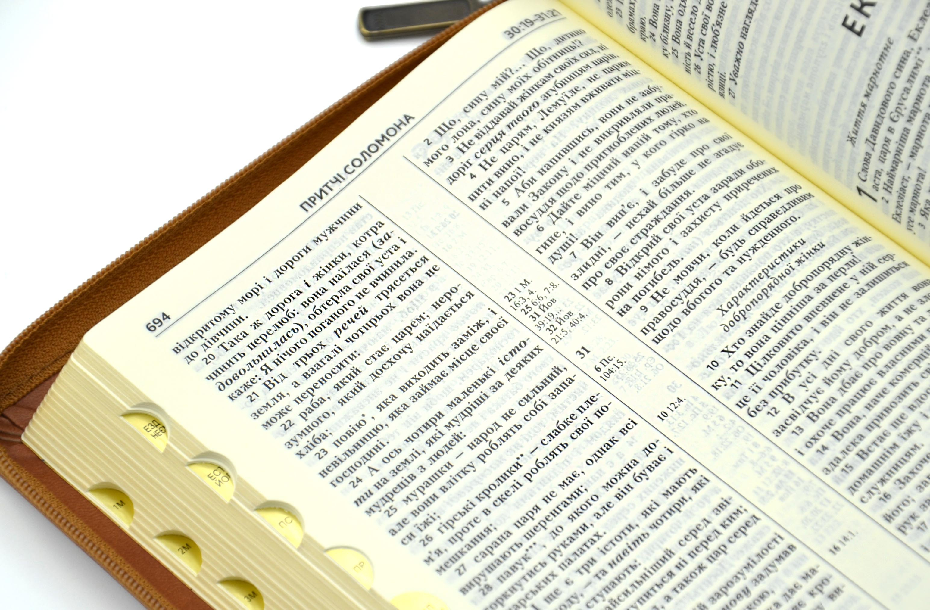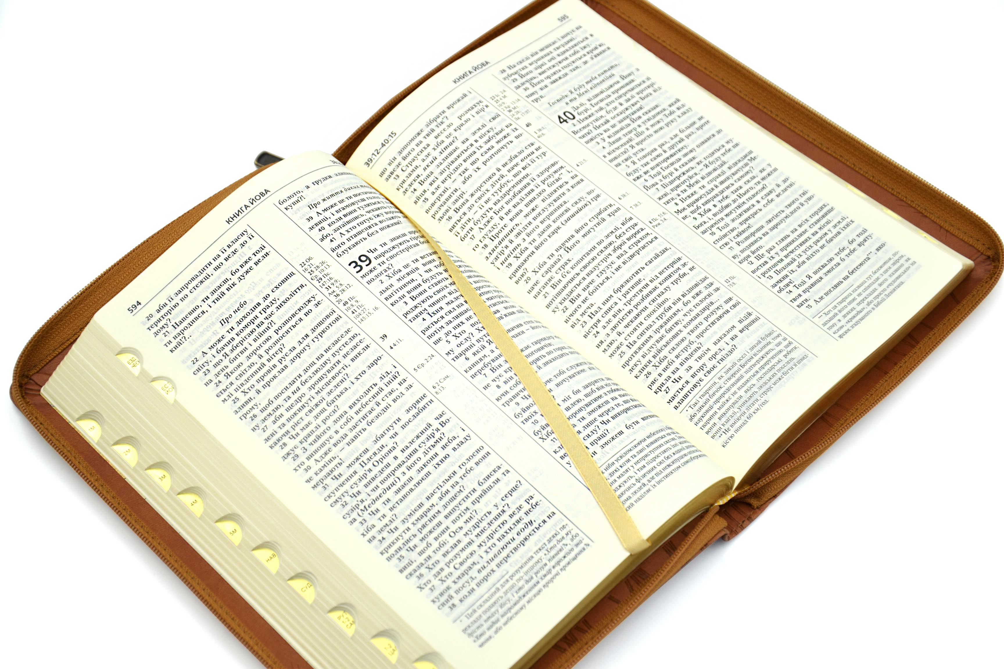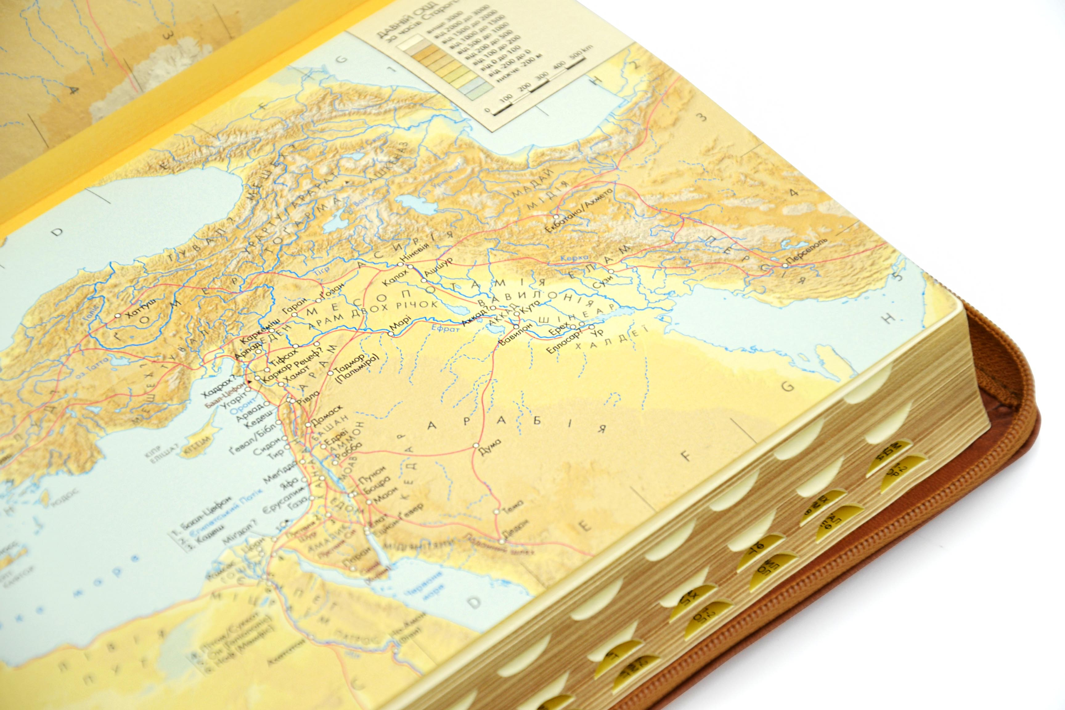 Книги Святого Письма Старого й Нового Заповіту, в сучасному перекладі із мови давньоєврейської й грецької. Текст на сторінках розміщений у дві колонки з паралельними місцями посередині, виноски-пояснення внизу сторінки. В книзі є закладка, що допоможе швидко знайти потрібну сторінку. Також книга має м'яку палітурку із замінника шкіри та за застібку-блискавку для зручного носіння.