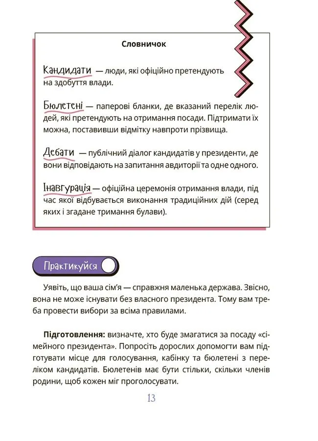 Видання рекомендовано для дітей 6–10 років. Воно ідеально підходить для спільного читання дорослих із дітьми, адже містить інтерактивні завдання після кожного розділу. Це допоможе закріпити нові знання та зрозуміти складну тему політики.