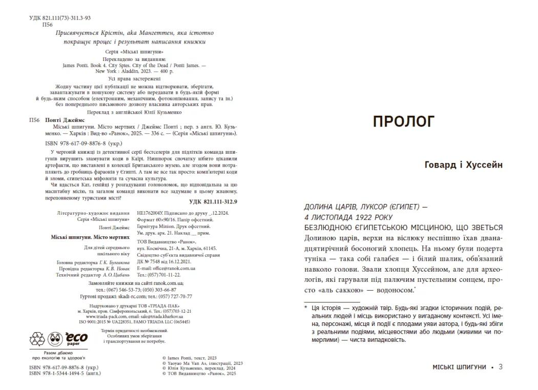 У захопливій книжці "Міські шпигуни. Місто мертвих" від Джеймса Понті команда юних шпигунів вирушає до Каїра, щоб розгадати складні комп'ютерні коди та розкрити таємниці гробниць фараонів. Ця книга є продовженням популярної детективної серії, що здобула багато прихильників серед підлітків.