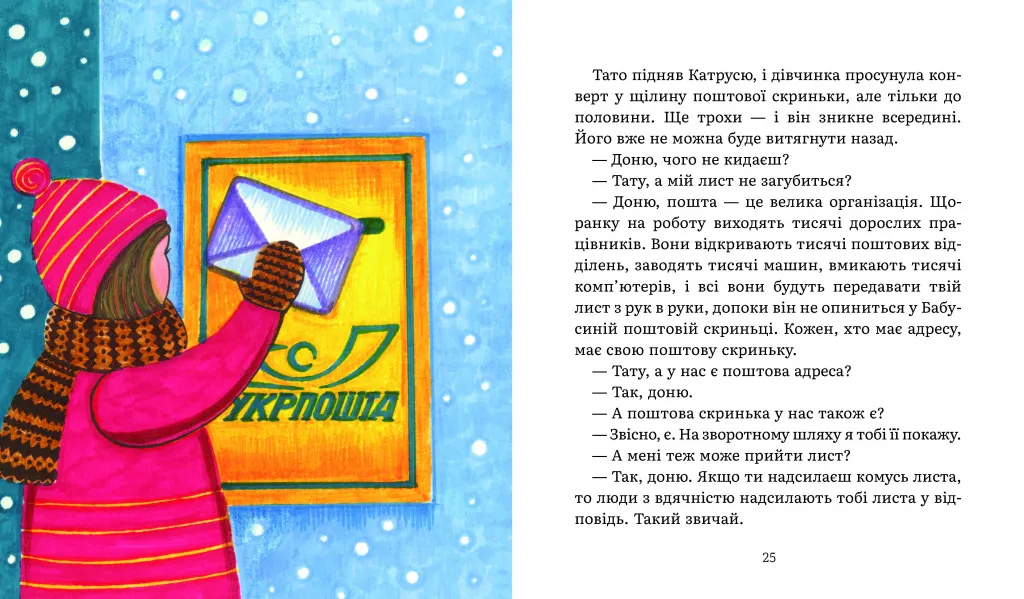 Казка, що зігріває читачів серед зими, зацікавлює дитину листуванням, бо написання листів та очікування відповіді на них створюють невидимий, але міцний зв’язок між людьми. скриньці листа у відповідь.