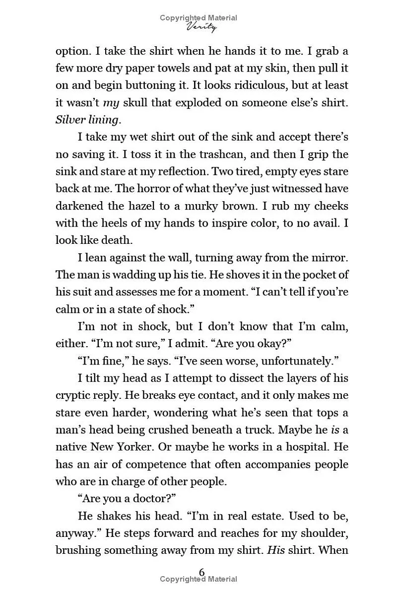Lowen arrives at the Crawford home, ready to sort through years of Verity's notes and outlines, hoping to find enough material to get her started. What Lowen doesn't expect to uncover in the chaotic office is an unfinished autobiography Verity never intended for anyone to read. Page after page of bone-chilling admissions, including Verity's recollection of the night their family was forever altered.