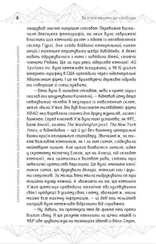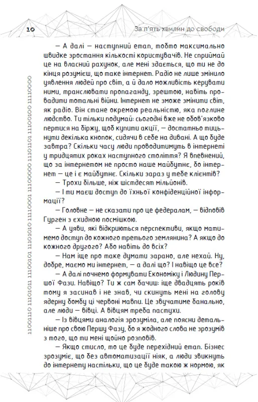 "За п'ять хвилин до свободи" – це захоплюючий науково-фантастичний роман, що переносить читача у кінець XXI століття. Олександр Сіводін створив динамічну історію, сповнену технічних інновацій, інтриг та боротьби за свободу.