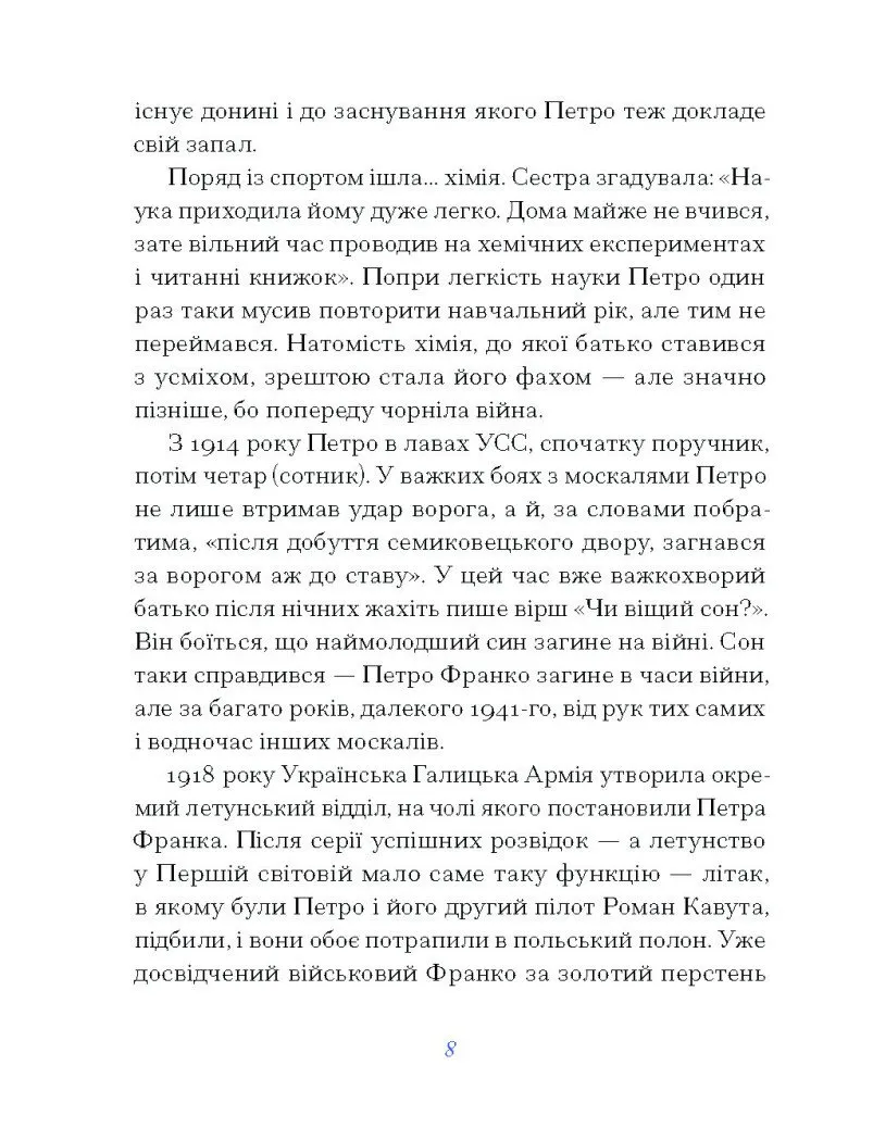 Петро Франко — авіатор, хімік, педагог і письменник. Один із засновників "Пласту", а також активний учасник українських національних процесів. Його творчість — це поєднання військових пригод, наукового підходу та пошуку власної ідентичності.