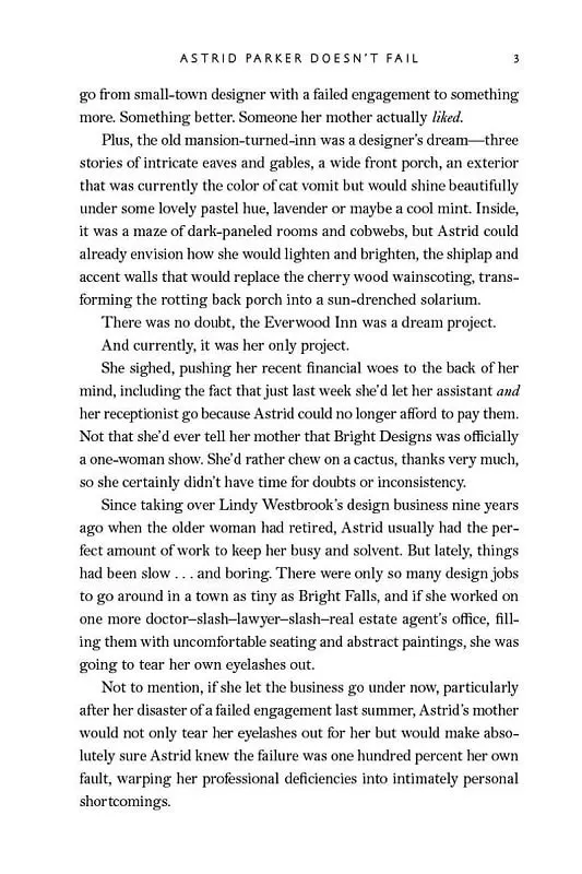 Для Астрід Паркер поразка — неприйнятна. Відтоді як рік тому вона розірвала заручини, її головною метою стала кар’єра. Тож коли Пру Евервуд просить її стати дизайнеркою в проєкті з оновлення готелю Everwood Inn, який транслюватиметься у популярному телешоу про ремонти, Астрід у захваті. Це ідеальна можливість відволіктися від невдалого заручення, вдихнути нове життя у власний бізнес і — можливо — нарешті заслужити схвалення своєї вічно незадоволеної матері.