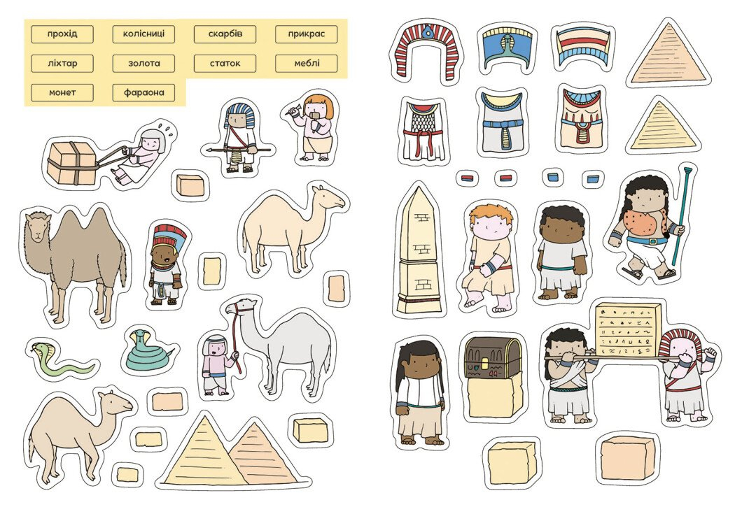 - Більше ніж 100 наліпок для доповнення сторінок книжки та створення власного пригодницького світу Давнього Єгипту.