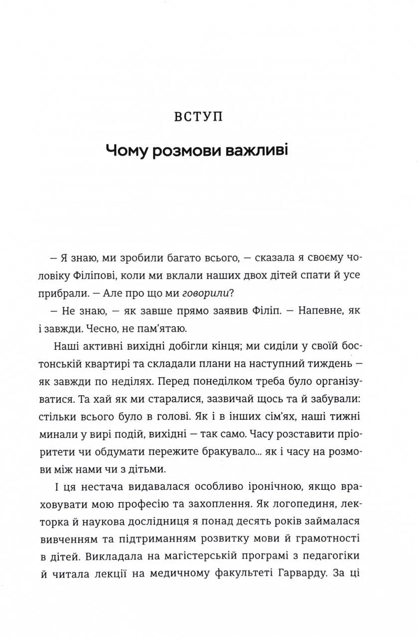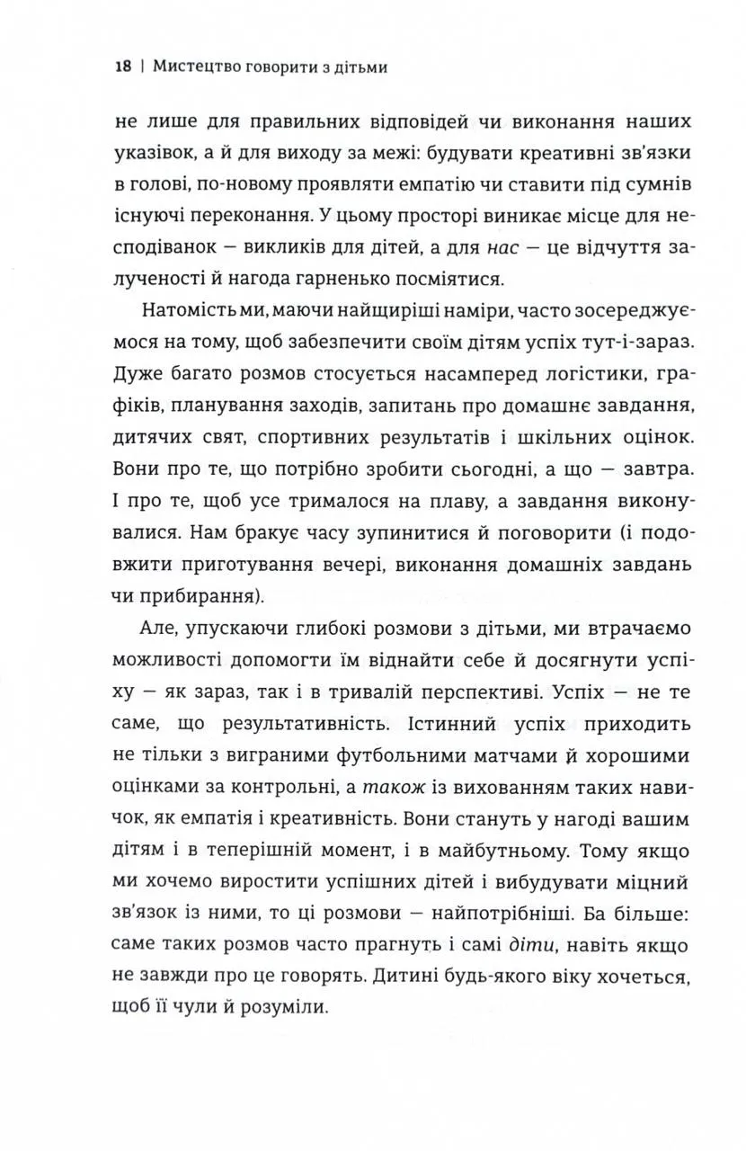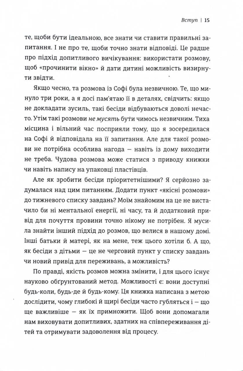 У цьому практичному виданні авторка ділиться простими, але ефективними стратегіями, що допомагають створювати змістовні бесіди з дітьми. Її підхід заснований на новітніх дослідженнях у сфері нейропсихології та дитячого розвитку. Вона розкриває, як розмови можуть стати інструментом формування впевненості, самоусвідомлення та здорової самооцінки у дітей.