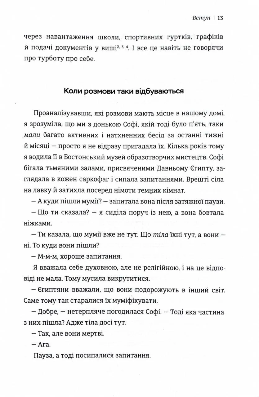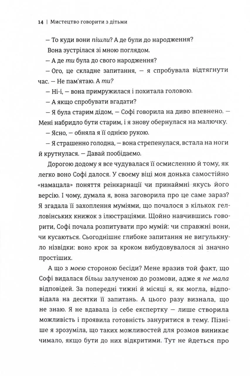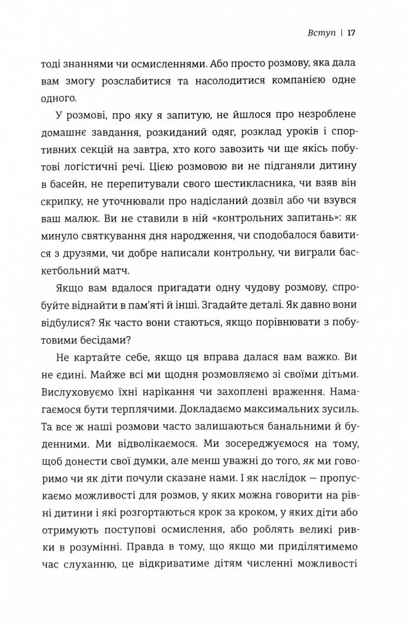 У цьому практичному виданні авторка ділиться простими, але ефективними стратегіями, що допомагають створювати змістовні бесіди з дітьми. Її підхід заснований на новітніх дослідженнях у сфері нейропсихології та дитячого розвитку. Вона розкриває, як розмови можуть стати інструментом формування впевненості, самоусвідомлення та здорової самооцінки у дітей.