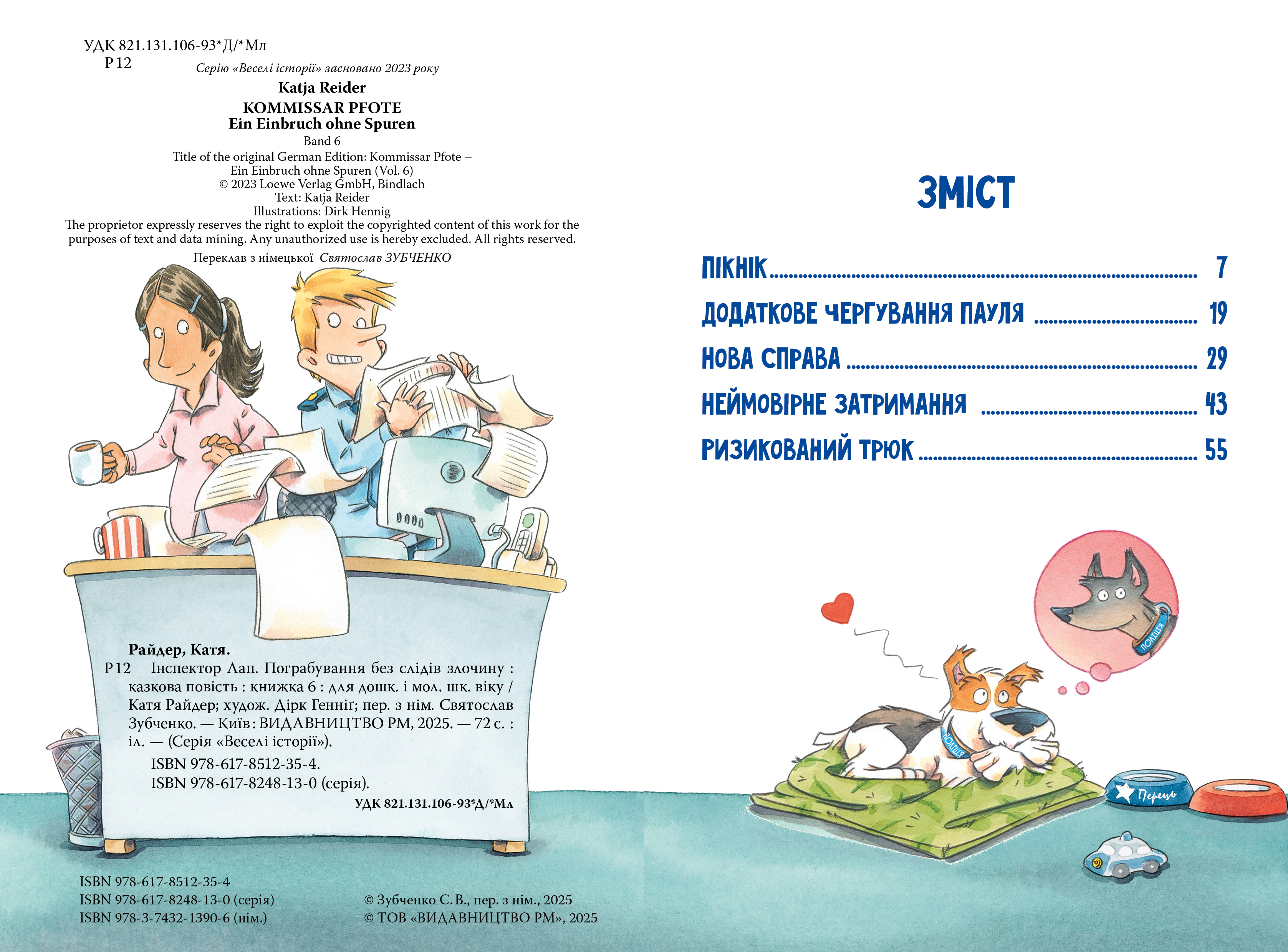 Книга Інспектор Лап. Пограбування без слідів злочину — це шоста частина популярної дитячої серії від авторки Райдер Каті. Головний герой — поліцейський пес на ім'я Перець, якого всі знають як Інспектора Лапа. Разом зі своїм двоногим напарником Паулем він розслідує заплутані злочини у світі, де навіть собаки мають інстинкти першокласних детективів.