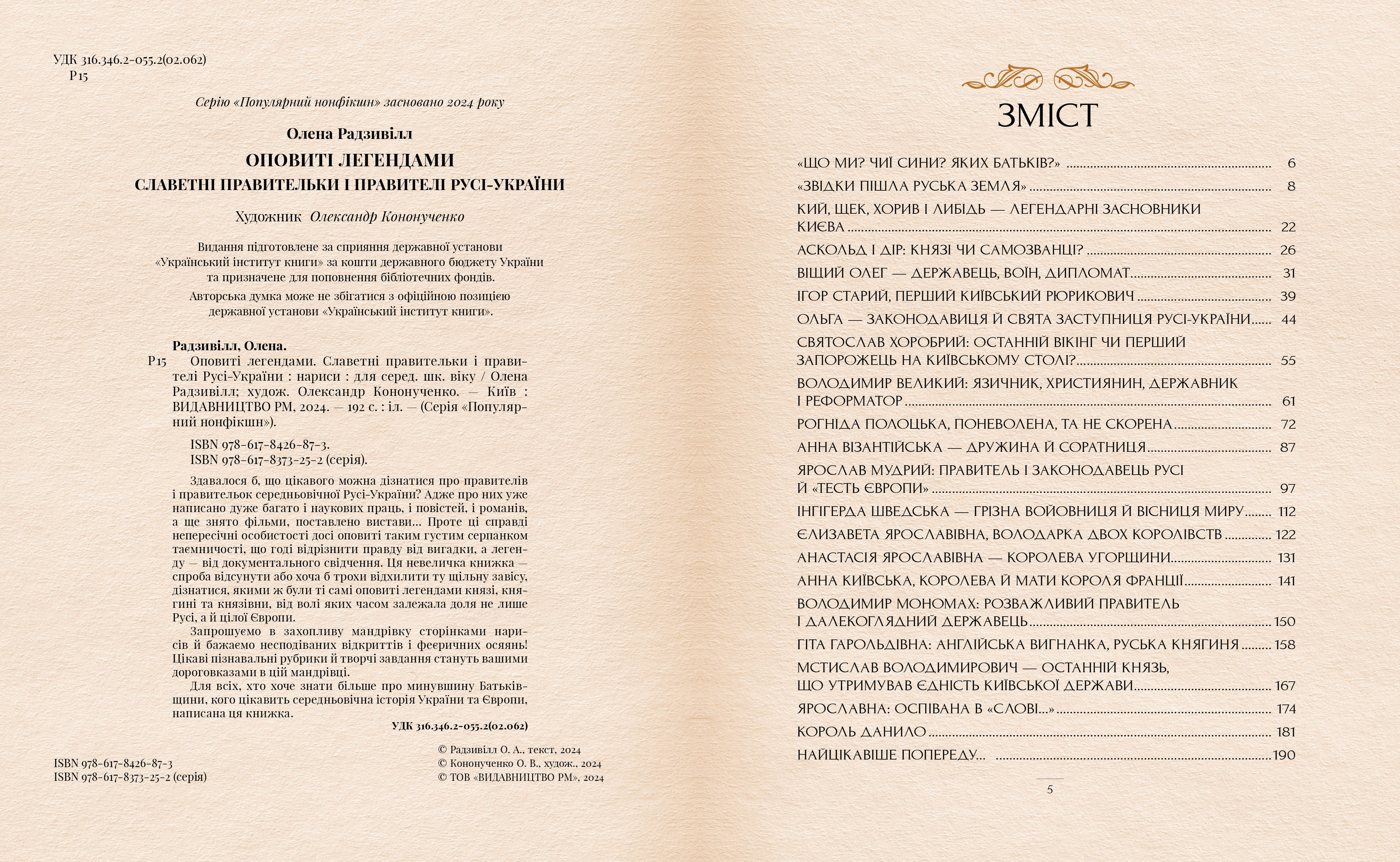 Книга Оповиті легендами. Славетні правительки і правителі Русі-України авторства Олени Радзивілл — унікальне видання, що відкриває завісу над загадковими постатями давньої української історії. Сучасне оформлення та цікава подача матеріалу роблять її особливо привабливою для широкого кола читачів.