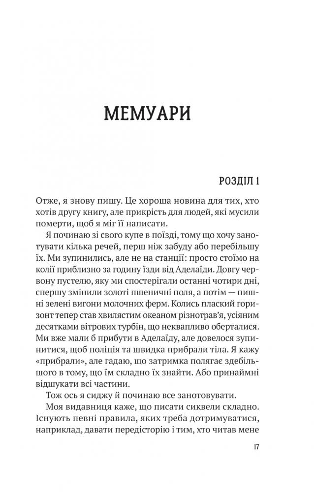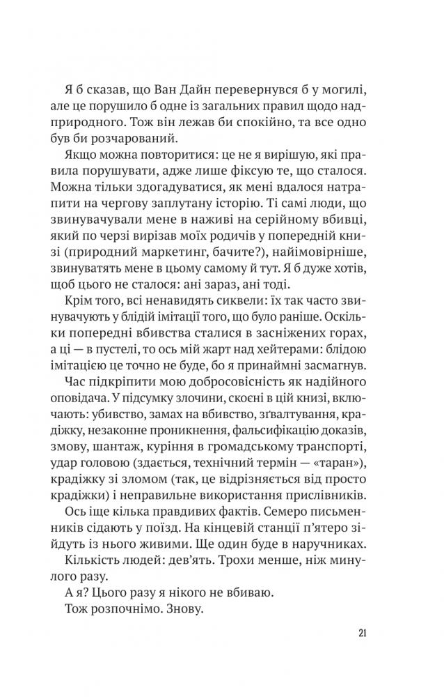 Саркастичний стиль Ернеста, його гумор і абсолютна відвертість із публікою робить цей детектив літературним скарбом, що здивує навіть досвідчених читачів. У романі «Усі в цьому поїзді — підозрювані» Бенджамін Стівенсон веде напрочуд майстерну метаоповідь, що лишається тільки захоплюватися всім його вигадливим трюкам із сюжетом і продовжувати химерну мандрівку потягом від Дарвіна до Аделаїди.