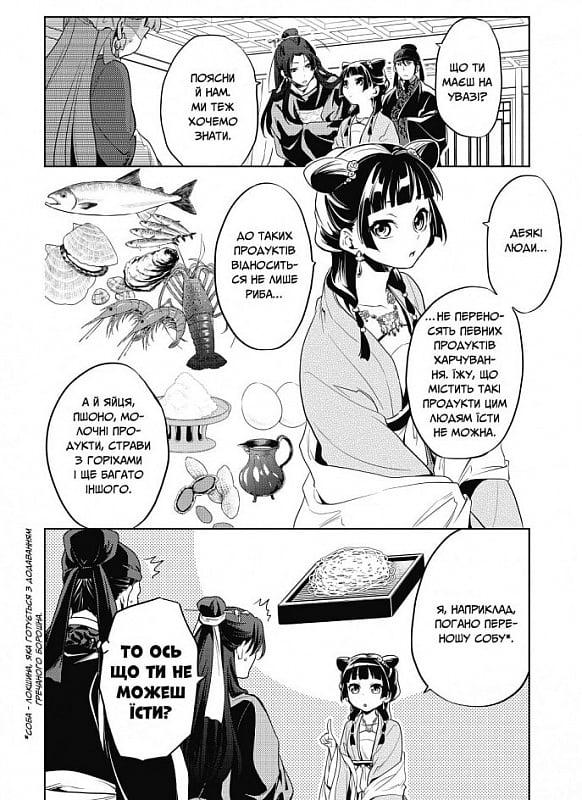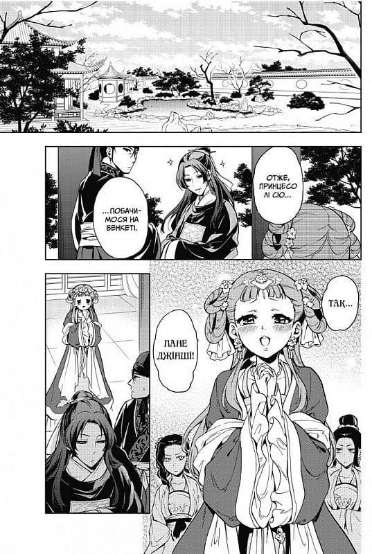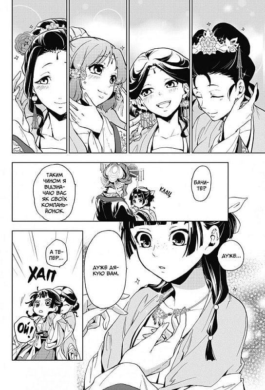 Після зняття «прокляття» з імператорських спадкоємців придворна служниця, обдарована талантом лікування травами, отримує підвищення до дегустаторки їжі... і одразу потрапляє в саму гущу придворних інтриг у цій розкішно ілюстрованій детективній серії! Травниця Маомао за волею придворного євнуха Джінші призначена покоївкою принцеси Гьокуйо. Одного разу їй доручає роботу сам імператор і Маомао потрапляє на свій перший імператорський бенкет. Керована притаманною їй цікавістю та жагою до розслідувань, Маомао несподівано для себе привертає увагу присутніх на рауті.