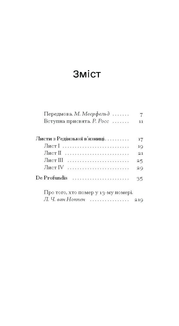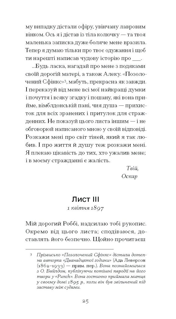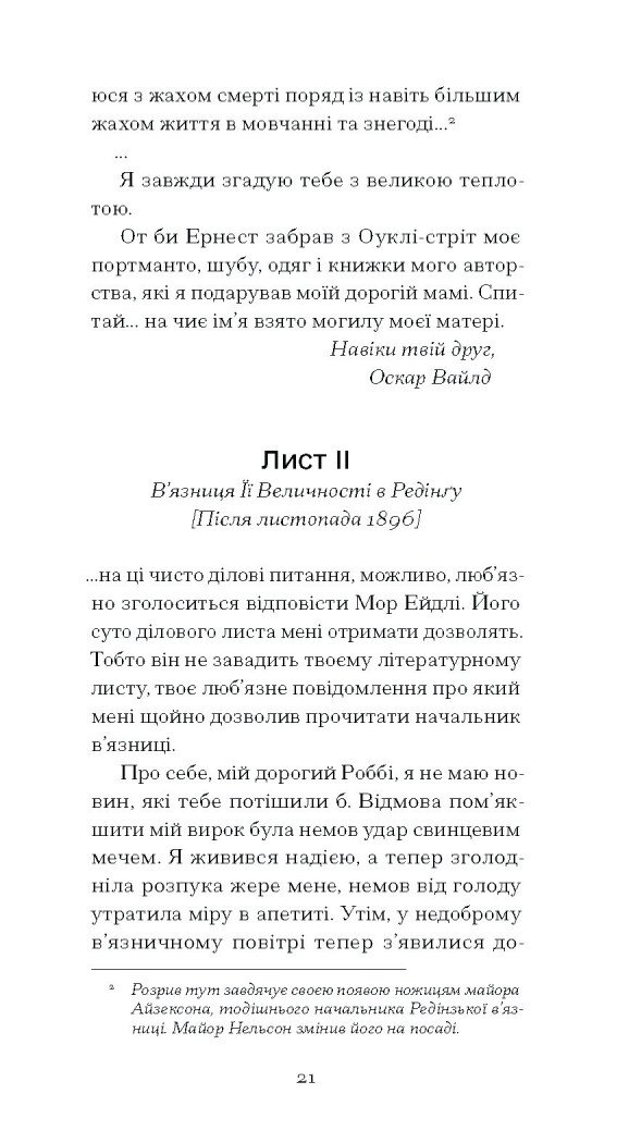De Profundis — це одна з найглибших та найболючіших праць Оскара Вайлда, написана ним у Редінзькій в'язниці. Твір є листом до його колишнього коханця та приятеля Альфреда Дуґласа, з яким Вайлда пов’язувала складна та пристрасна історія. Листи, зібрані у книзі, відображають внутрішній шлях самопізнання, розчарування та надії митця.