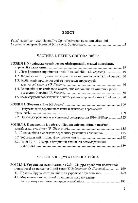 У виданні запропоновано реконструкцію подій Першої та Другої світових воєн у межах дискурсу соціальної антропології. Основну увагу приділено розкриттю низки проблем, пов’язаних із життєвими стратегіями різних категорій та груп українського суспільства, моделями їхньої поведінки та способами виживання в складних умовах війни. З’ясовано визначальні риси глобальних збройних конфліктів, сформовано уявлення про будні пересічних мешканців українських міст і сіл в умовах окупаційних режимів. Проаналізовано соціальні програми й доброчинні заходи, спрямовані на подолання життєвих негараздів уразливих груп населення, визначено роль громадських інституцій і соціальної самоорганізації в цих процесах, висвітлено людські й матеріальні втрати внаслідок війн, шляхи повернення до мирного способу життя, реевакуаційні заходи. Схарактеризовано процес формування пам’яті про Першу та Другу світові війни.