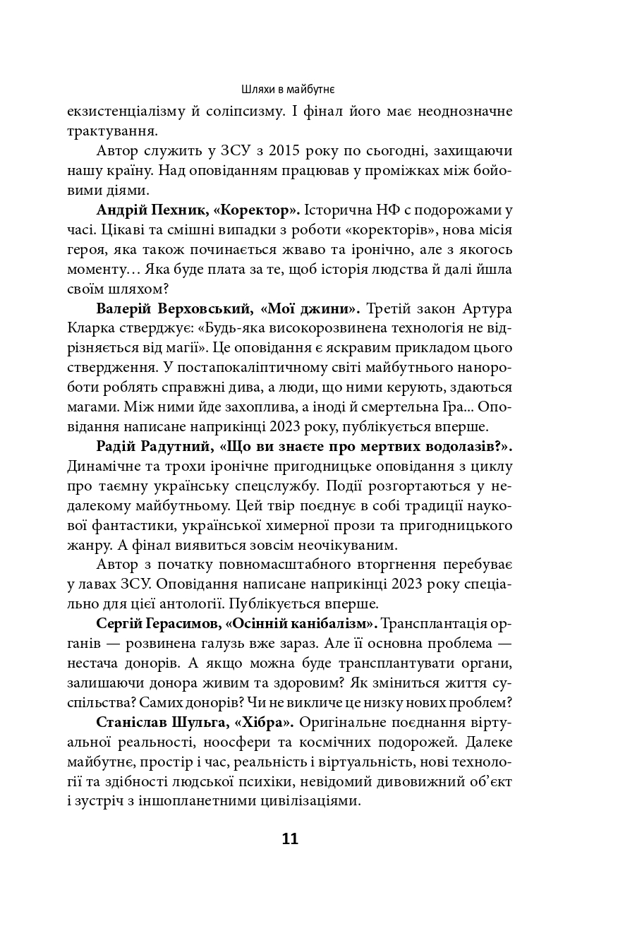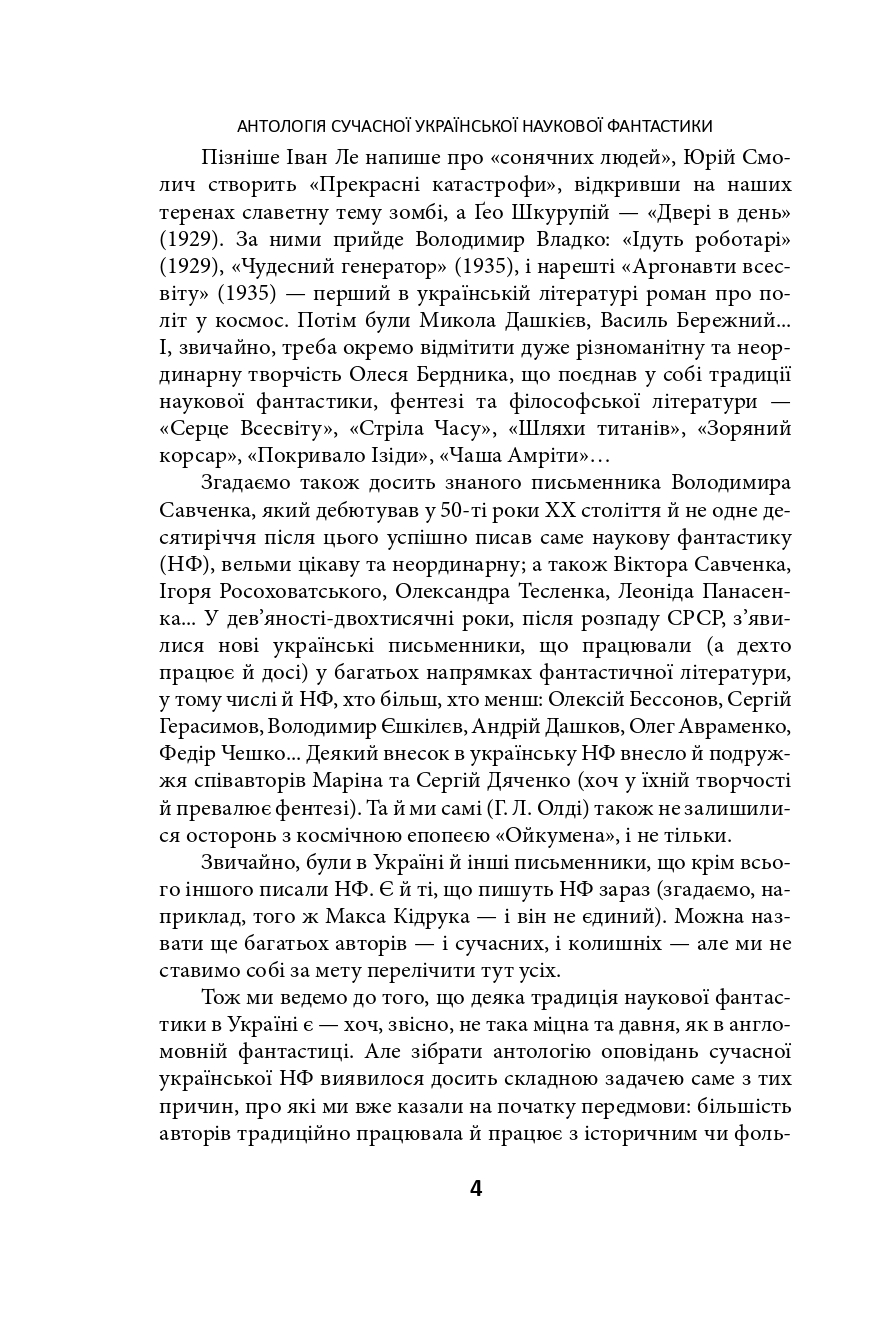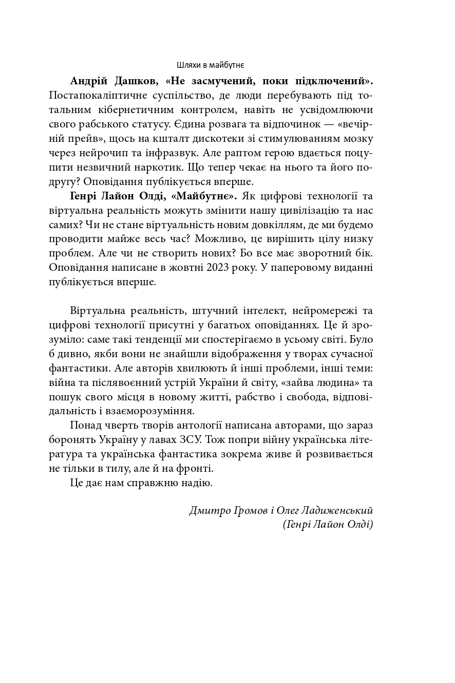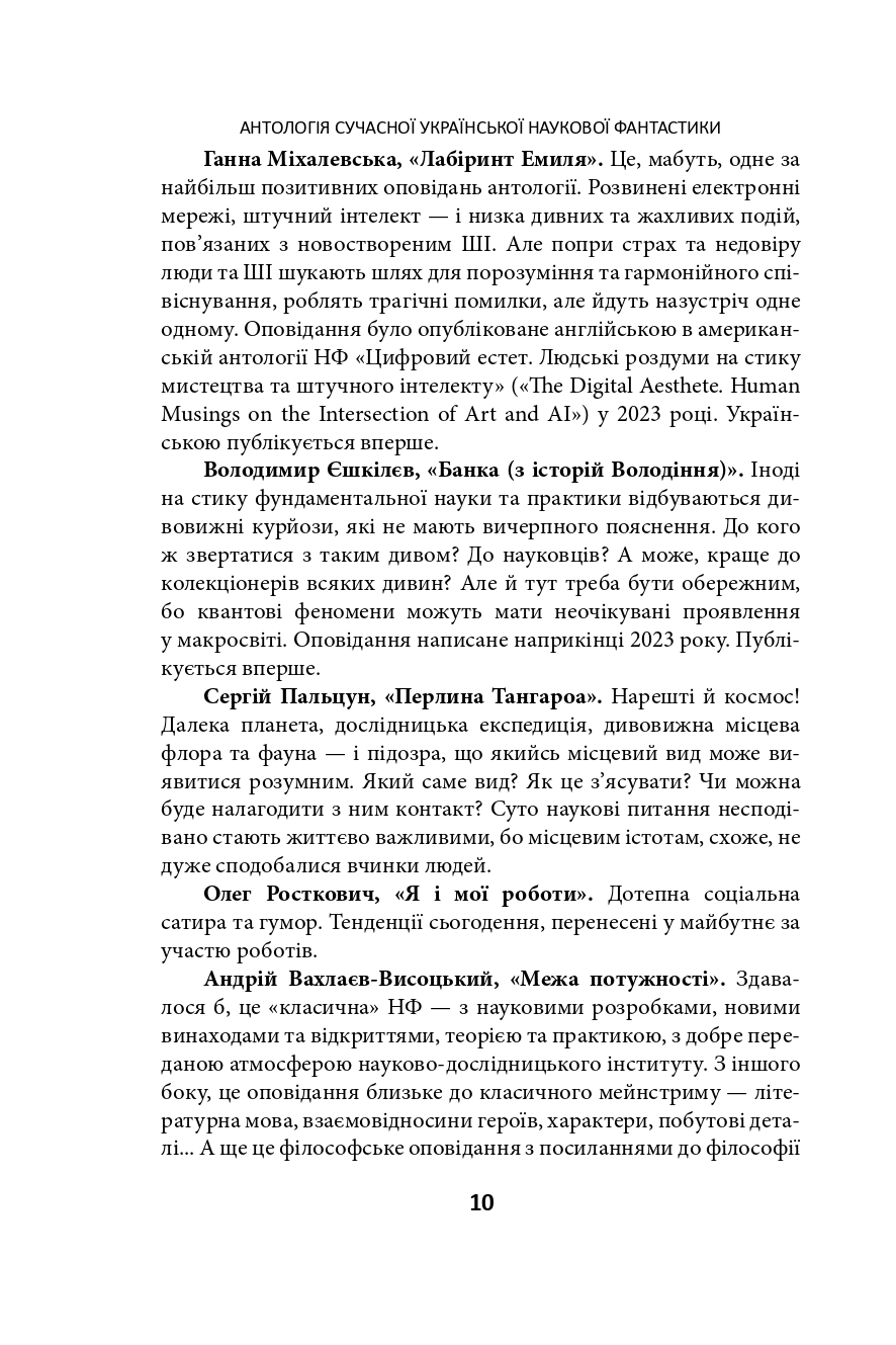 До Антології української наукової фантастики ввійшли новели сучасних українських письменників. Укладачі збірки Дмитро Громов і Олег Ладиженський (Г. Л. Олді) зазначають, що темами багатьох оповідань Антології є віртуальна реальність, штучний інтелект, нейромережі, цифрові технології. Такі тенденції спостерігаються в усьому світі, і було б дивно, якби вони не знайшли відображення у творах сучасної наукової фантастики. Авторів хвилюють й інші проблеми, інші теми: війна та післявоєнний устрій України і світу, «зайва людина» й пошук свого місця в новому житті, рабство і свобода, відповідальність і взаєморозуміння.