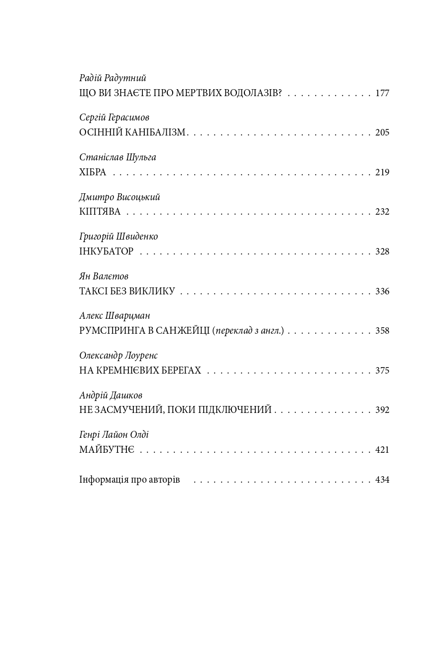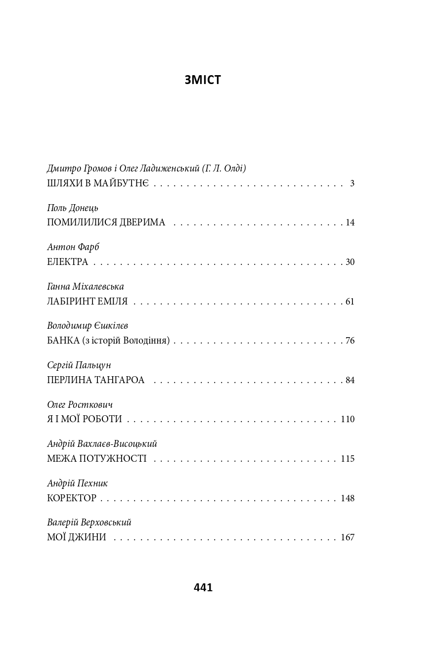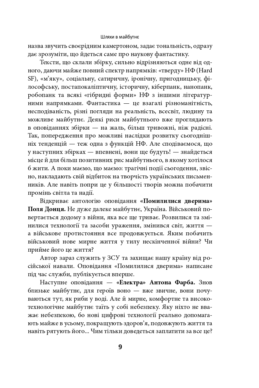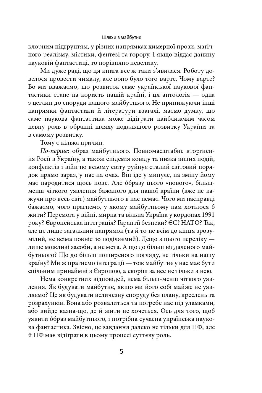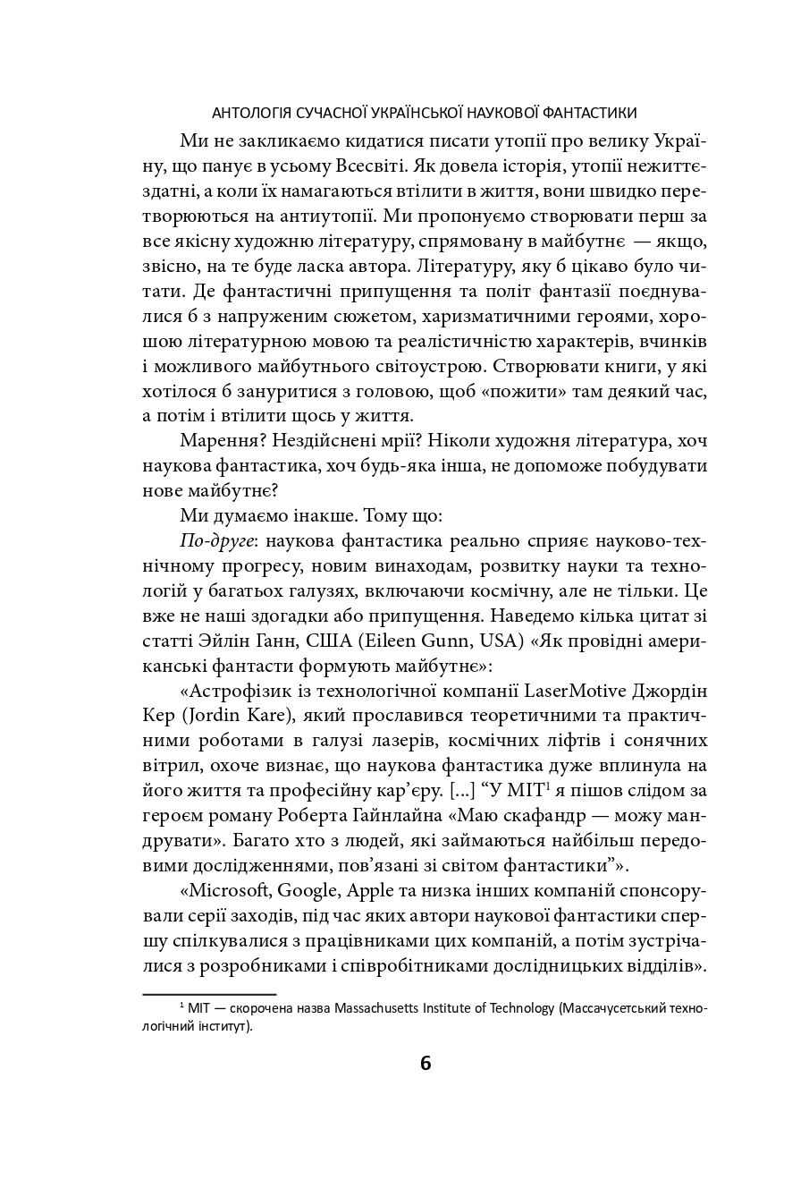 До Антології української наукової фантастики ввійшли новели сучасних українських письменників. Укладачі збірки Дмитро Громов і Олег Ладиженський (Г. Л. Олді) зазначають, що темами багатьох оповідань Антології є віртуальна реальність, штучний інтелект, нейромережі, цифрові технології. Такі тенденції спостерігаються в усьому світі, і було б дивно, якби вони не знайшли відображення у творах сучасної наукової фантастики. Авторів хвилюють й інші проблеми, інші теми: війна та післявоєнний устрій України і світу, «зайва людина» й пошук свого місця в новому житті, рабство і свобода, відповідальність і взаєморозуміння.