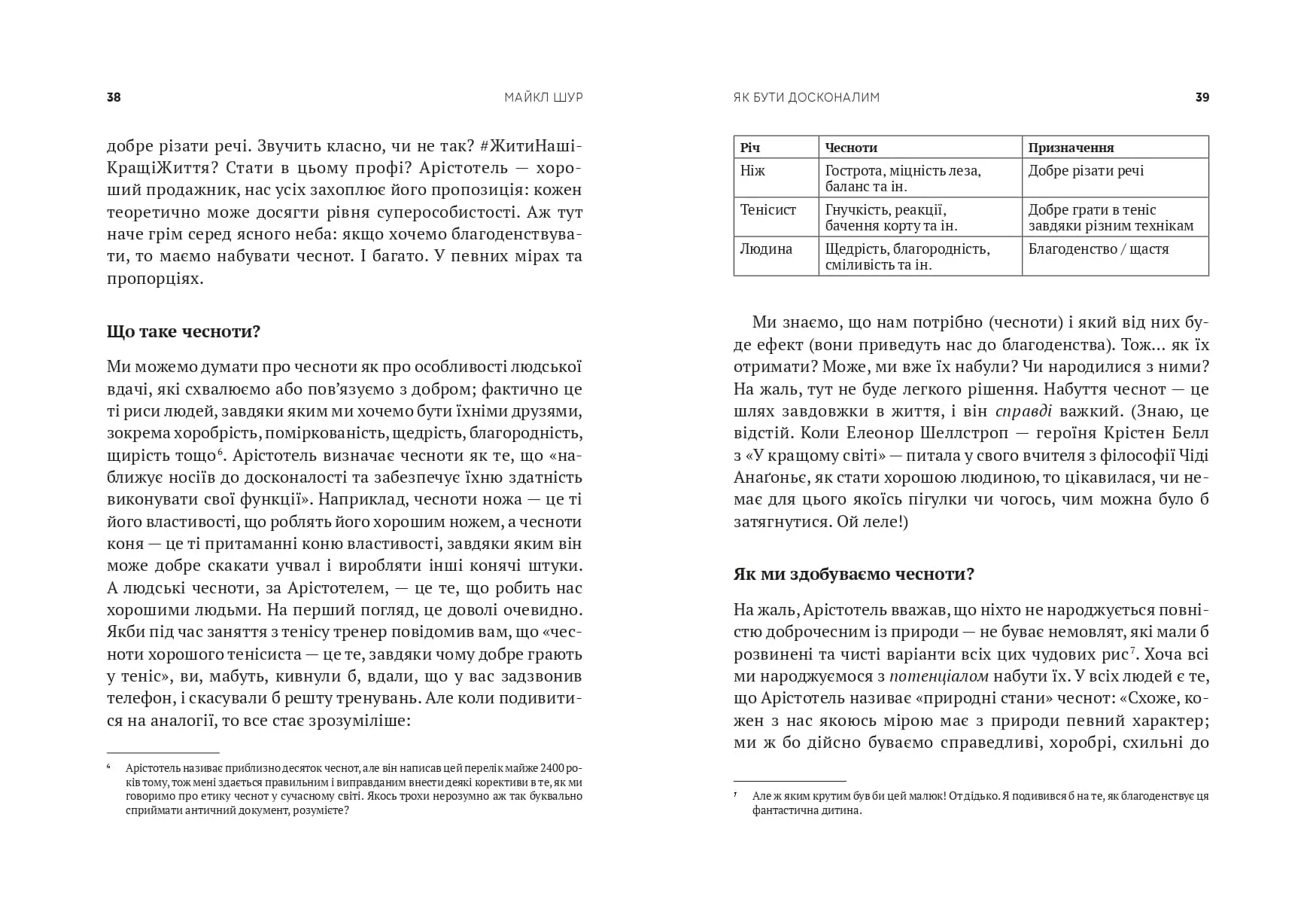 Майкл Шур починає з дуже конкретних і легких запитань на кшталт: «Чи можна бити друга в обличчя?», «Чи варто збрехати подрузі та похвалити її жахливу блузку?», «Чи повертати продуктовий візок з автостоянки в супермаркет?». Продираючись крізь хитросплетіння уявних етичних експериментів та проблемних ситуацій із власного життя, автор підіймається до все більш складних та контроверсійних тем, які складають актуальне етичне тло наших днів.