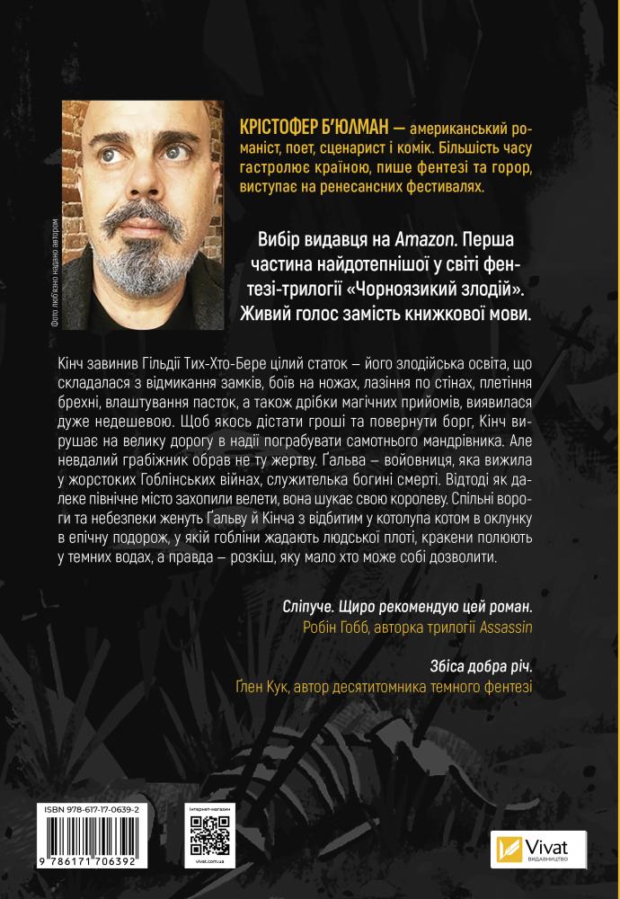Книга «Чорноязикий злодій» — це темне фентезі від американського письменника Крістофера Б'юлмана. Для Кінча На Шаннака бути грабіжником — справжнісіньке мистецтво, тому чоловік здобував злодійську освіту: його натренували правильно битися, плести інтриги й розставляти хитрі пастки. Герой винен своїм учителям за навчання та змушений виконувати їхні накази, поки не сплатить борг. Шаннак зачаївся в нетрях лісового гостинця: він чекає на мандрівника, з якого витрусить усі цінні речі. Одначе розбійник не передбачив, що його наступній жертві під силу дати собі ради.