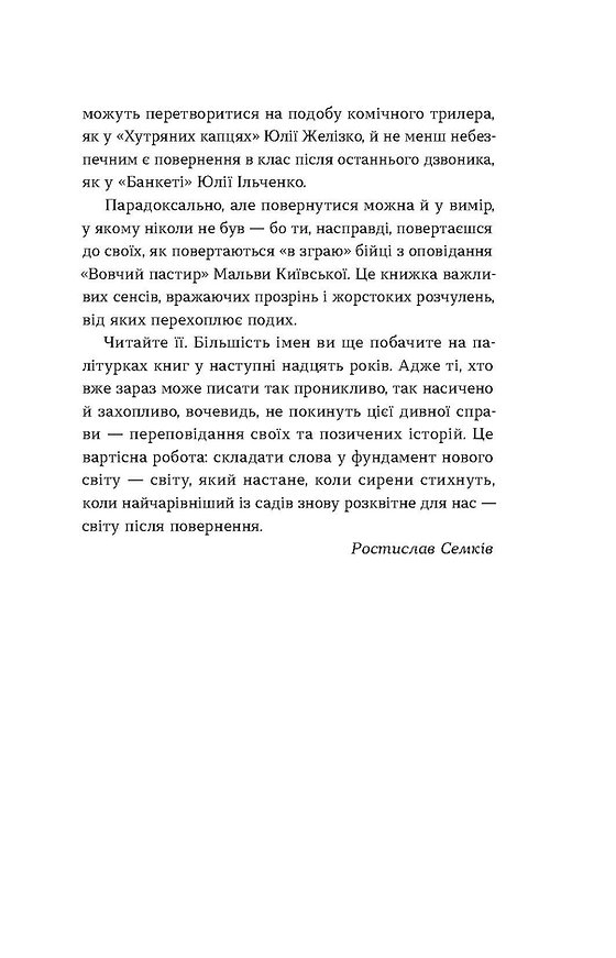 Антологія Повернення — це свіжий погляд на сучасну українську літературу. Автори, переважно молоді, щиро та глибоко осмислюють виклики сьогодення. Ця збірка стане важливим доповненням до домашньої бібліотеки кожного, хто цінує емоційну щирість, багатство образів та актуальність тем.
