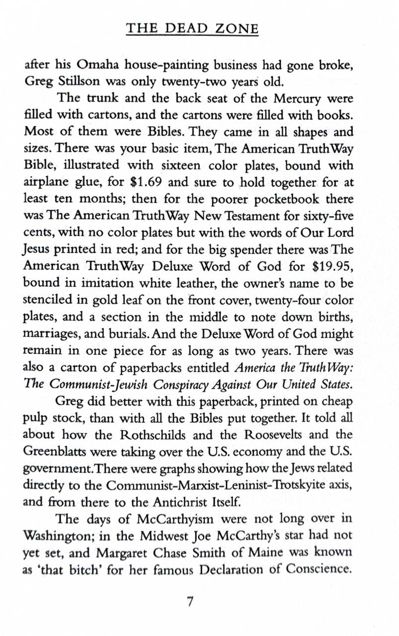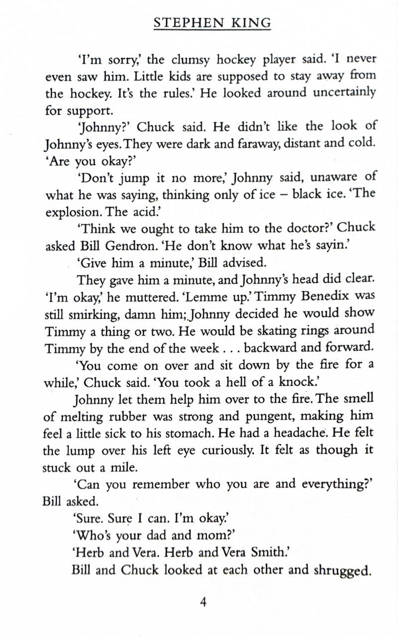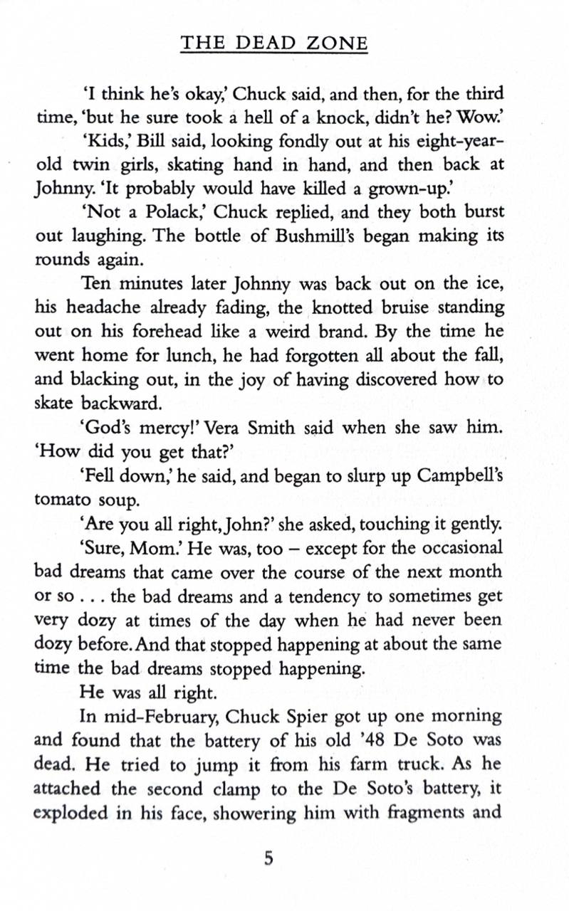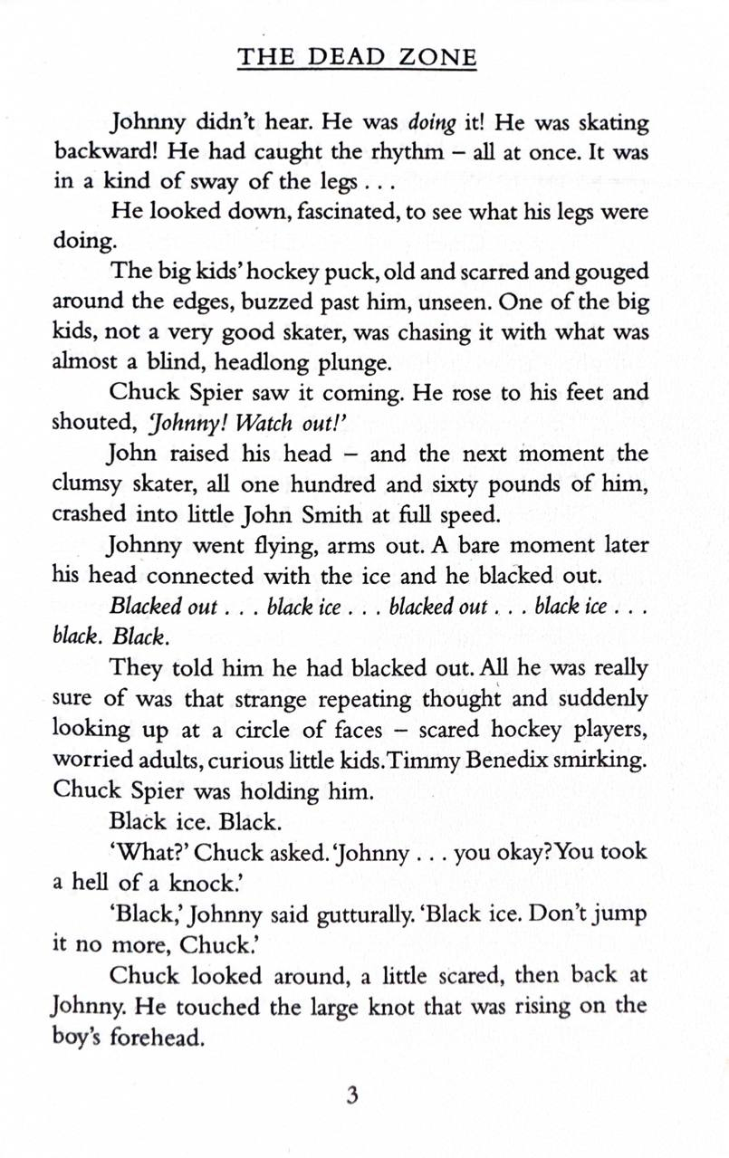 Johnny, the small boy who skated at breakneck speed into an accident that for one horrifying moment plunged him into... The Dead Zone. Johnny Smith, the small-town schoolteacher who spun the wheel of fortune and won a trip into… The Dead Zone. John Smith, who awakened from a seemingly interminable coma with an accursed power: the power to see the future and the terrible fate awaiting mankind in... The Dead Zone.
