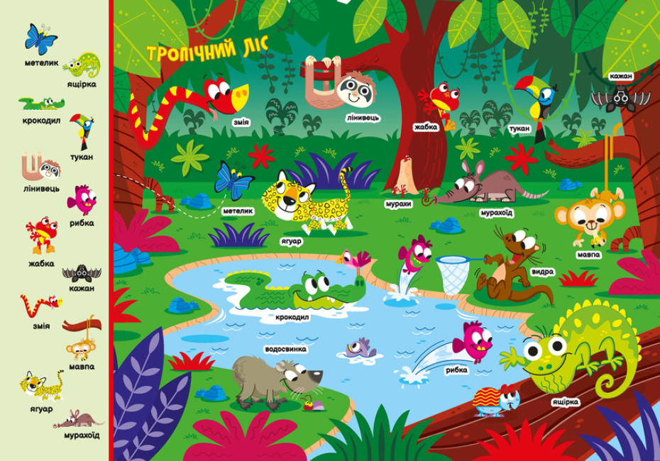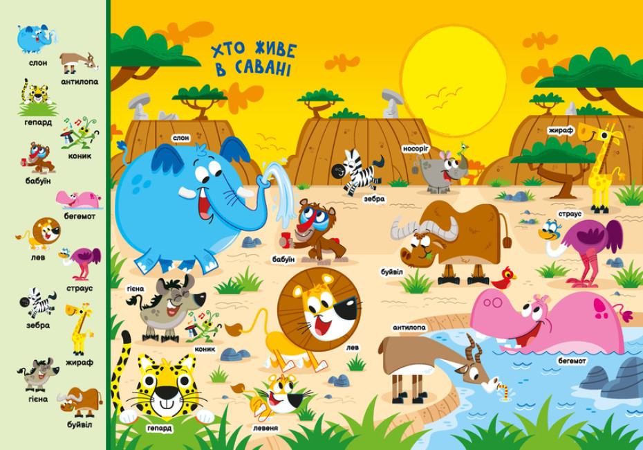 - Діти шукають улюблених тварин у різних середовищах – на фермі, у джунглях, пустелі, навіть під водою та в небі.