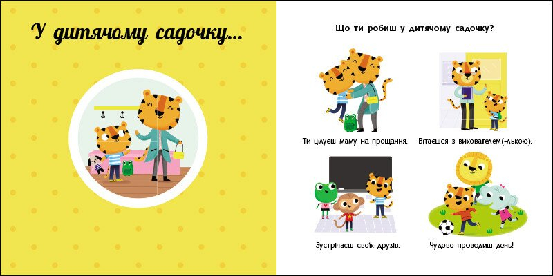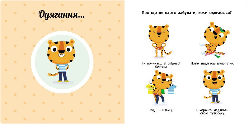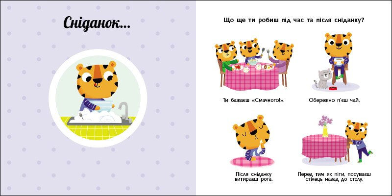 - Яскраві ілюстрації, зрозумілі образи й сюжети, які супроводжують щоденні дії малюка.