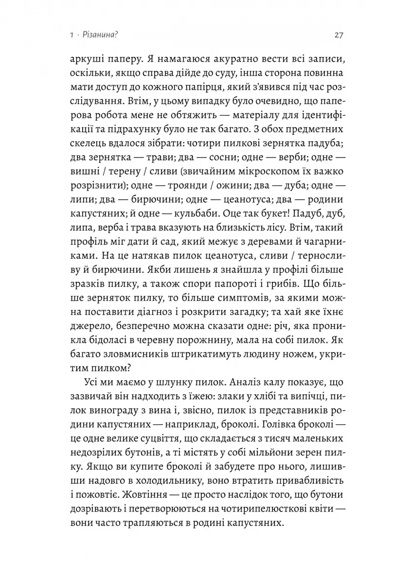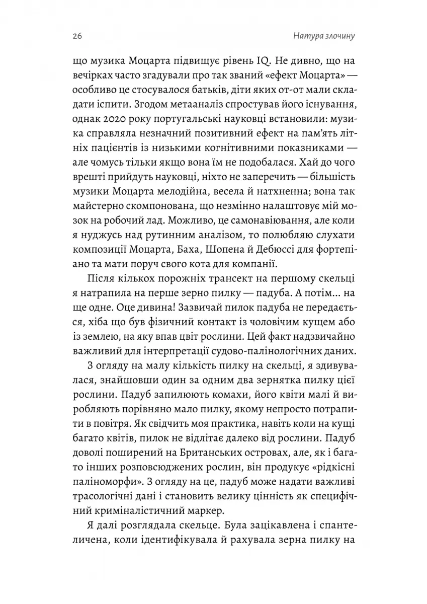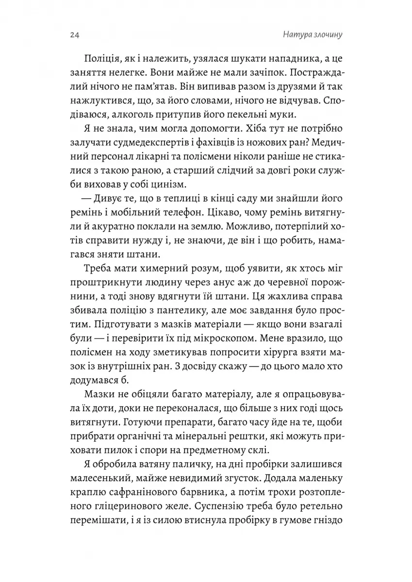 Книга Натура злочину. Підказки, які нам залишає природа — це не просто оповідь про судову експертизу. Це проникливе дослідження роботи найвідомішої судмедекспертки Великої Британії — Патриції Вілтшир. У цій книзі авторка розповідає про свою кар'єру, численні розслідування гучних злочинів та дивовижні наукові методи, які допомагають відтворити правду за допомогою самої природи.