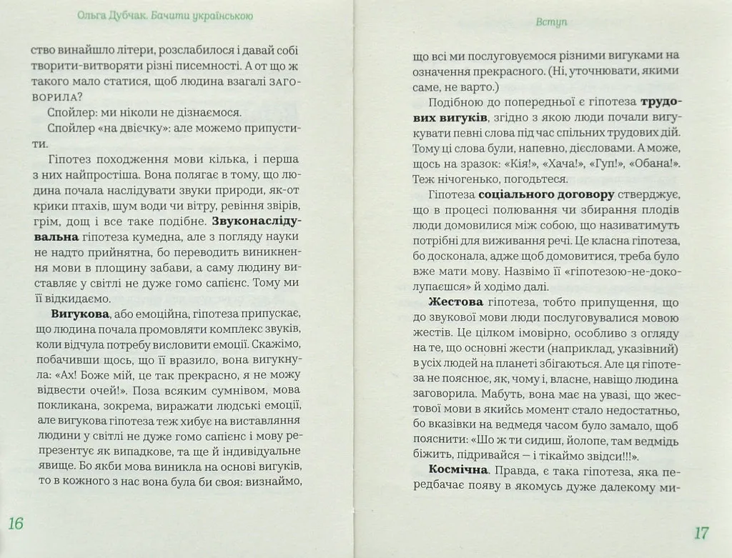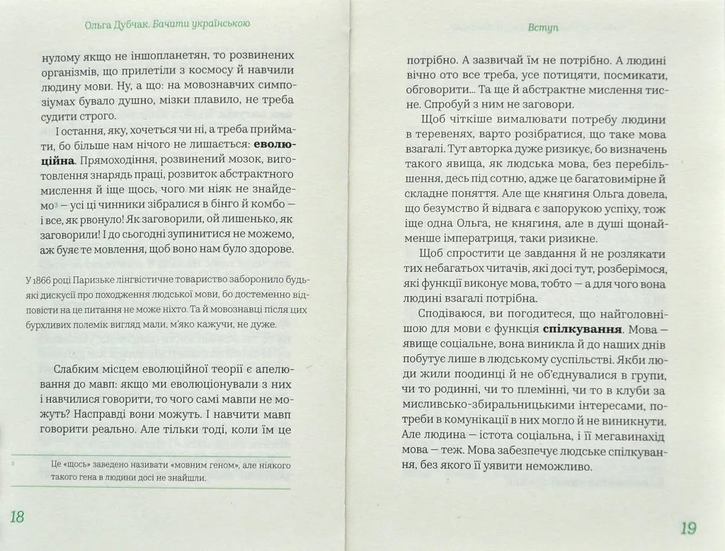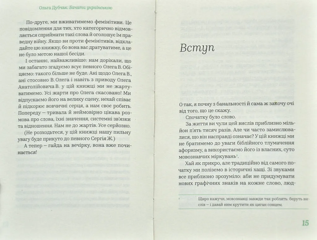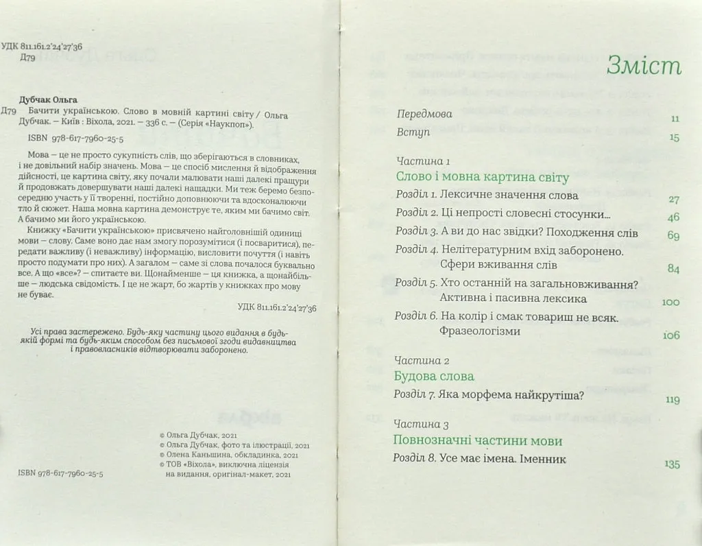 Книжку «Бачити українською» присвячено найголовнішій одиниці мови — слову. Саме воно дає нам змогу порозумітися (і посваритися), передати важливу (і неважливу) інформацію, висловити почуття (і навіть просто подумати про них). А загалом — саме зі слова почалося буквально все. А що «все»? — спитаєте ви. Щонайменше — ця книжка, а щонайбільше — людська свідомість. І це не жарт, бо жартів у книжках про мову не буває.