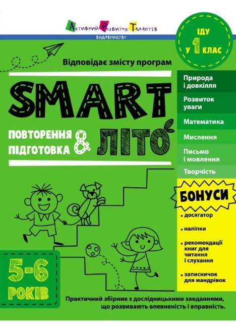 SMARTліто - практичний збірник з дослідницькими завданнями, що розвивають впевненість і вправність. Природа і довкілля, розвиток уваги і математика, мислення і творчість, письмо і мовлення - креативні завдання на повторення та підготовку до наступного класу. А щоб було ще цікавіше, ми підготували й бонуси: досягатор, наліпки, записничок для мандрівок та рекомендації книг для читання і слухання. Проведіть літо з користю.