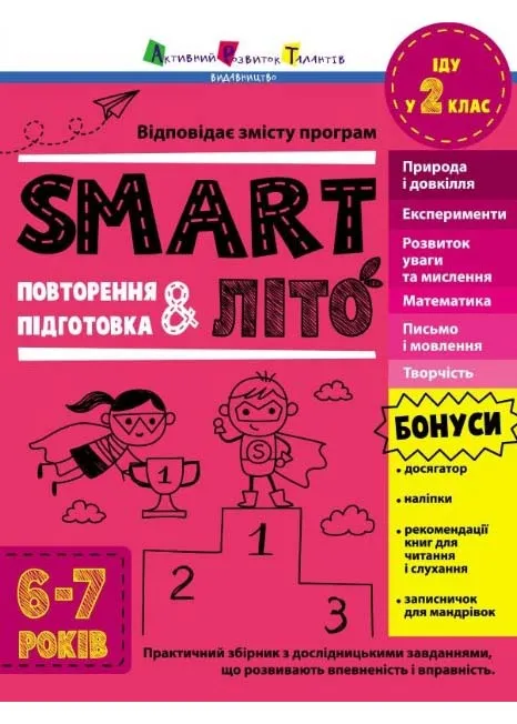 SMARTліто - практичний збірник з дослідницькими завданнями, що розвивають впевненість і вправність. Природа і довкілля, експерименти і математика, розвиток уваги і мислення, письмо і мовлення, а також творчість - креативні завдання на повторення та підготовку до наступного класу. А щоб було ще цікавіше, ми підготували й бонуси: досягатор, наліпки, записничок для мандрівок та рекомендації книг для читання і слухання. Проведіть літо з користю.