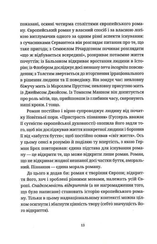 Письменник спирається на феноменологічну філософію Едмунда Гуссерля, у своїх роздумах показуючи, як людське прагнення до прогресу та пізнання може призводити до втрати власного, унікального світу. Кундера акцентує увагу на важливості роману в історії Європи, підкреслюючи, що роман – це не просто жанр чи форма оповіді, а особливий спосіб людського існування, здатний захищати людство від забуття.