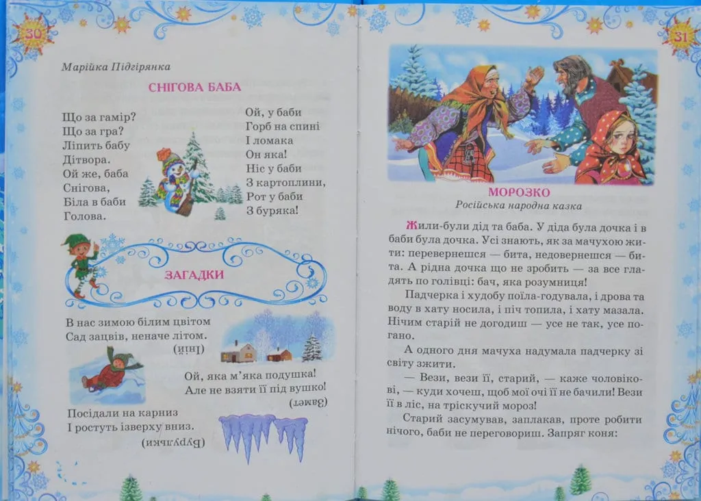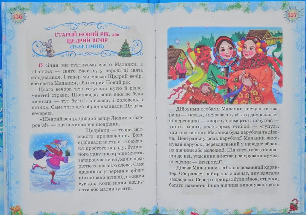 Читанка знайомить дітей з традицією святкування найбільших зимових свят українського народу: днем Святого Миколая, Різдвом Христовим, Меланки або Щедрим вечором. У книзі діти прочитають народні казки, улюблені твори українських письменників, прислів’я та приказки, а також загадки, присвячені веселій зимовій порі.