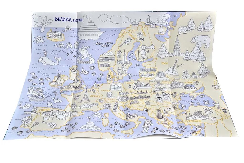 Карта Європи у вигляді великої розмальовки – це найкоротший шлях до навчання через гру.Після розфарбовування карта перетвориться у справжній витвір мистецтва і прикрасить інтер’єр, якщо Ви її помістите вдома у зручному для дитини місці, або у школі у відповідному осередку класу, або ж у дитячому садочку – у гральному куточку групи.Відкривайте разом із дитиною найвідоміші пам’ятки архітектури та символи країн Європи, а також тварин, рослин і мешканців водного світу, які характерні для певних географічних регіонів!