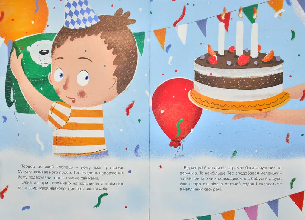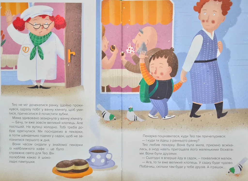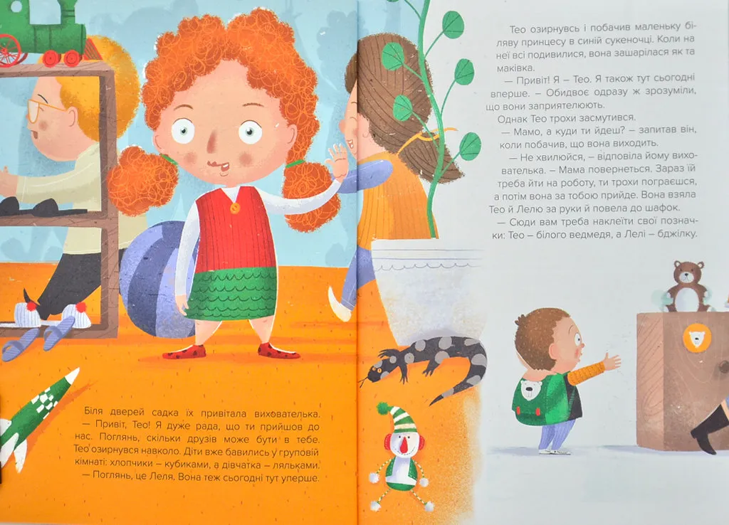 Тео – хлопчик, якому довелося вперше в житті залишитися без мами аж на цілий день. У садочку Тео зустрів дівчинку Лелю, яка також прийшла сюди вперше . Діти подружилися й почали разом бавитися, слухати казкові історії і навчатись. Як виявилося, не такий уже і страшний той дитячий садок.
