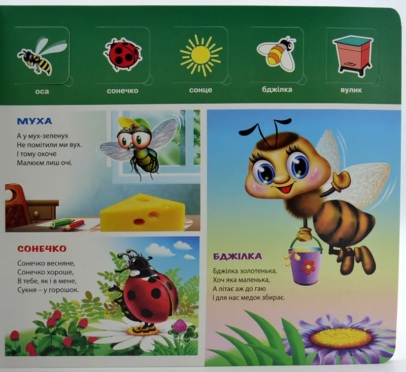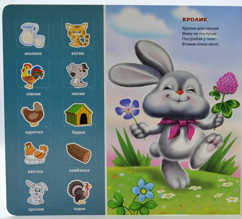 Мандруючи сторінками книги, діти познайомляться з навколишнім світом. Зможуть легко і весело запам'ятовувати значення слів, вивчати назви кольорів, геометричні фігури. А відкриваючи кожне з 50 віконець, розміщених на сторінках книжечки, діти отримають додаткову для розвитку інформацію, яку неодмінно запам'ятають.