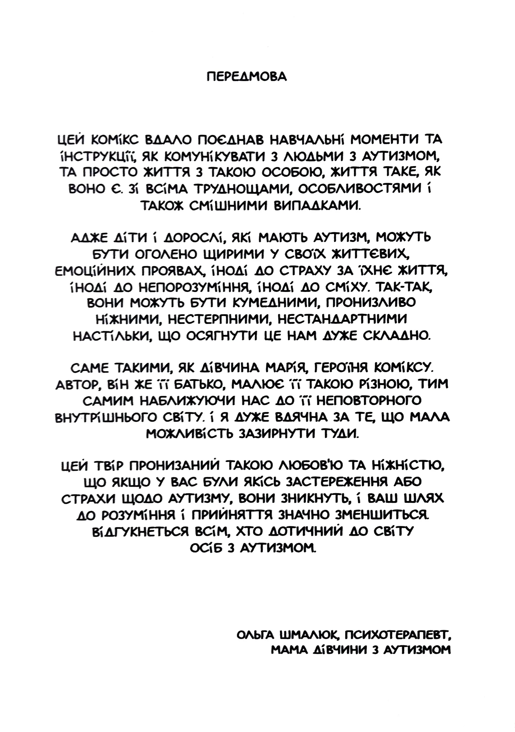 Комікс "Марія і я" - це автобіографічна розповідь про мандрівку Марії, тринадцятирічної дівчинки з аутизмом, та її тата на відпочинок. Через малюнки Мігеля Гаярдо ми знайомимося з його донькою: дізнаємося про її смаки та звички, щоденні ритуали, в яких вона віднаходить спокій і контроль. Бачимо буденні ситуації, які спантеличують дівчинку, викликають у неї бурхливі емоції та стають викликом для її оточення. Зустрічаємо родичів, сусідів, знайомих, що люблять Марію і приймають її такою, якою вона є. Прийняття та любов - це найважливіше послання цієї історії.