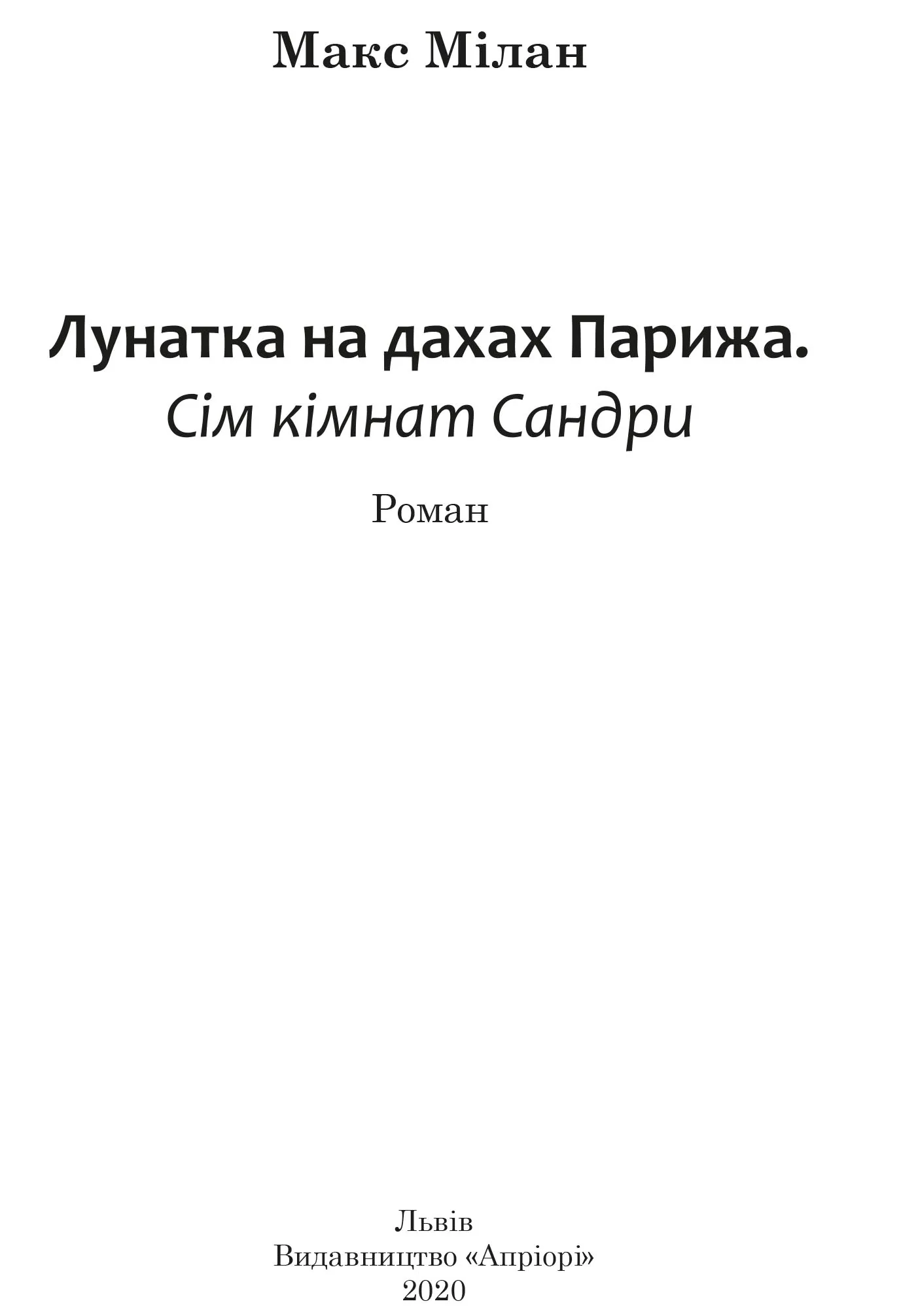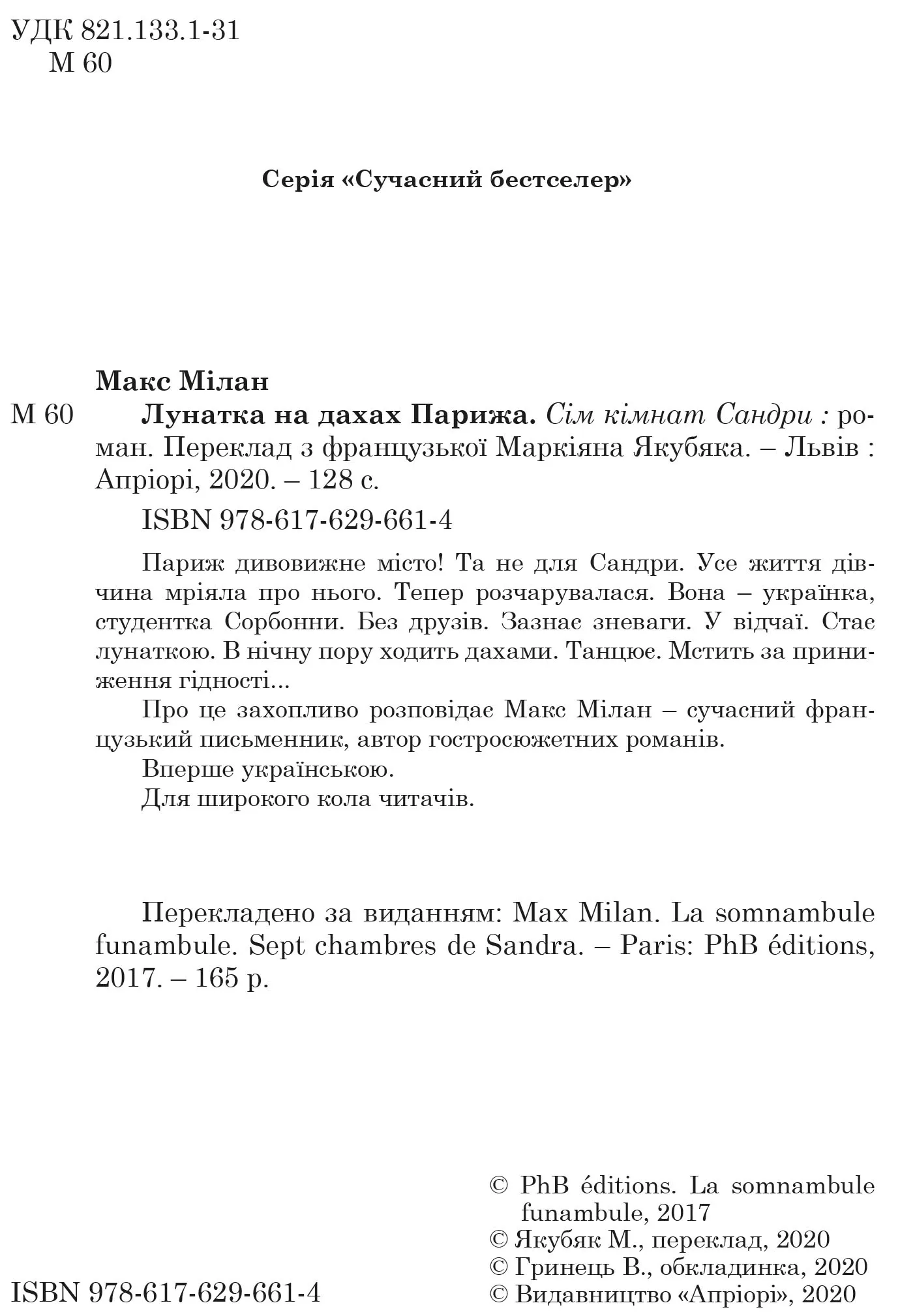"Лунатка на дахах Парижа" – це книга про те, як українська дівчина навчається в університеті Сорбонни. Вона все життя мріяла про Париж. Й ось нарешті її мрія здійснилася! Але чому замість того, щоб бути щасливою, Сандру огортає відчай та розчарування!?.. Безсонними ночами її можна зустріти на дахах паризьких будинків, де вона танцює як сновида. Кажуть, так вона комусь хоче відімститися – за завдані їй зневагу та образи... Що, зрештою, трапилося в житті цієї української студентки!? Про це ви зможете дізнатися, коли прочитаєте захопливо гостросюжетний роман сучасного французького письменника Макса Мілана. Українською мовою опубліковано вперше.