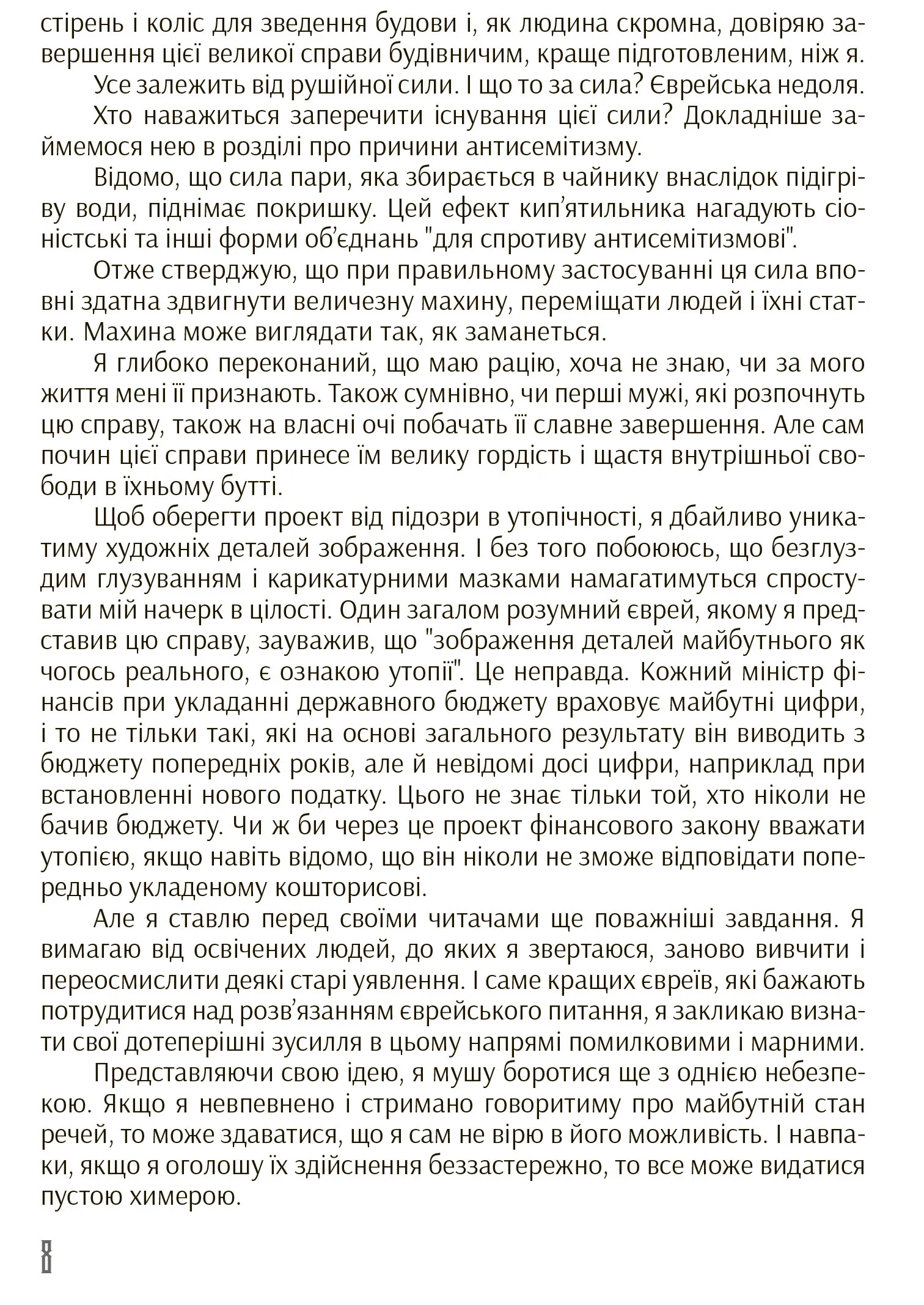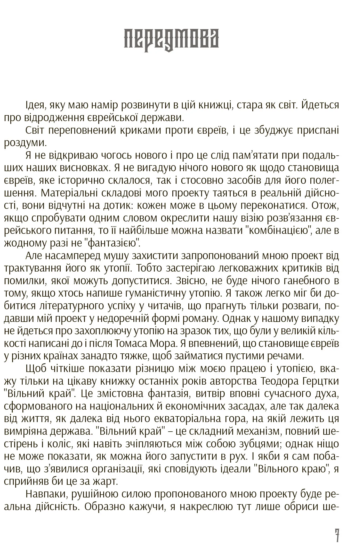 «Єврейська держава» Теодора Герцля є важливою пам’яткою єврейського народу, яка стала вихідною ідеєю для створення держави Ізраїлю. Цей твір був конкретною програмою побудови держави, яка після довгих суперечок була прийнята за основу для реалізації. Видання ілюстроване графікою видатного єврейського художника Ефраїма-Моше Лілієна, сподвижника Теодора Герцля, твори якого були знищені після приходу до влади німецьких нацистів. Твір перекладений багатьма мовами. Окремим виданням українською публікується вперше.