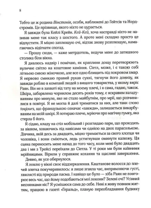 У цій теплій і водночас щемкій історії майстерно сплітаються події минулого й сьогодення. Головна героїня Кейлі Крейн не може повірити у власне щастя: вона успішна журналістка й наречена ідеального хлопця. Проте одна зустріч із безпритульним чоловіком — Кейдом Макаллістером, коханням цілого її життя, — несподівано змінює все. Він не впізнає Кейлі, але вона вирішує дізнатися, що сталося з ним, колишнім керівником фірми звукозапису, і допомогти йому владнати своє життя.Надзвичайна розповідь про щирі намагання, глибокі почуття й соціальні проблеми, які не варто ігнорувати…Winter Haven BooksЗворушлива історія про особистісне зростання та силу спогадів…Booklist