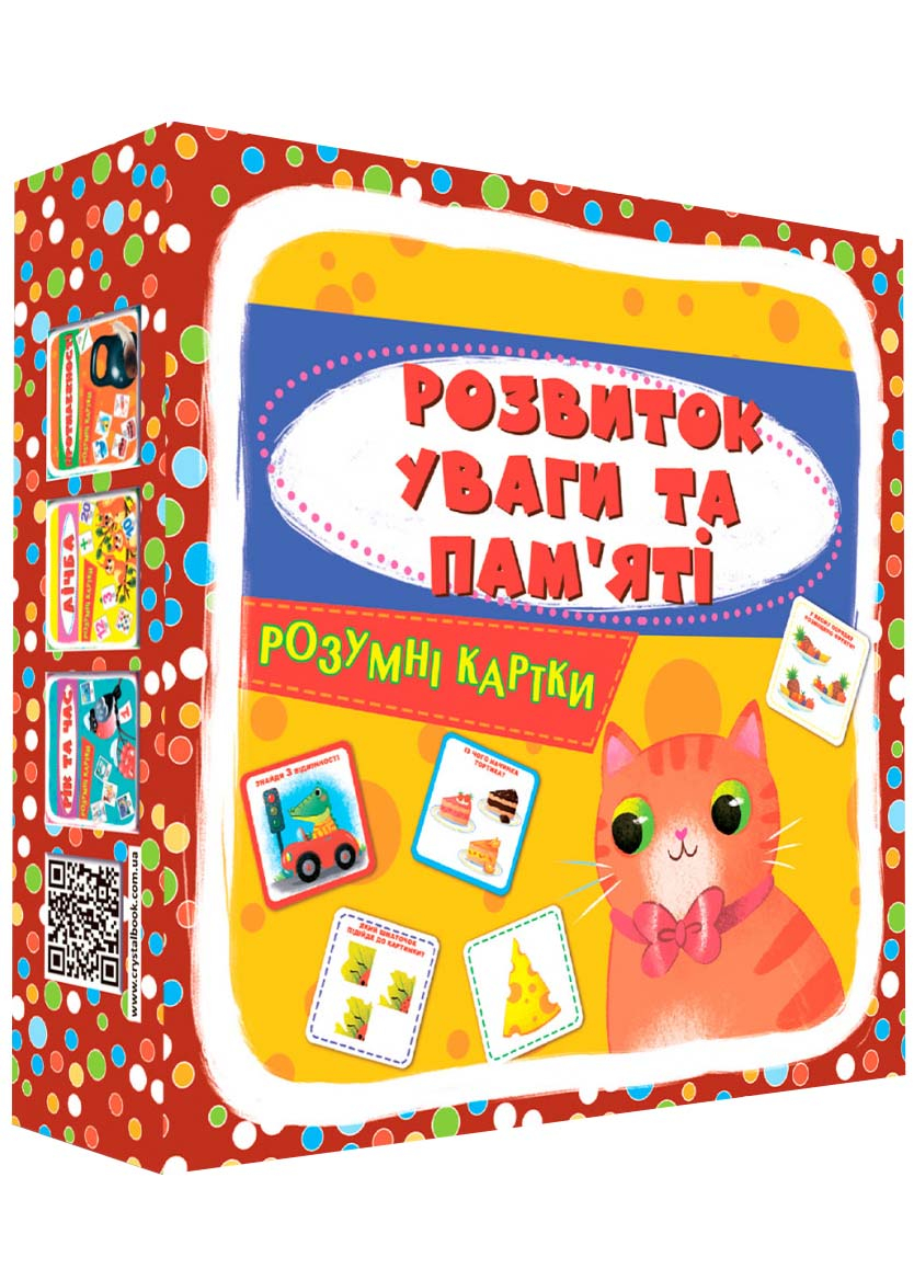 Набір «РОЗВИТОК УВАГИ ТА ПАМ'ЯТІ» складається з 30 карток і 5 типів завдань, що відрізняються за складністю. Цей навчально-ігровий комплект призначено для розвитку в дитини логічного мислення, мови й мовлення, розширення словникового запасу, тренування пам'яті та здатності концентрувати увагу. Він стане в пригоді під час підготовки до школи. Вашого малюка чекають завдання на: