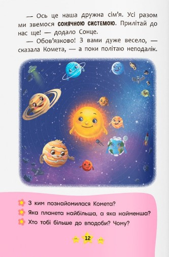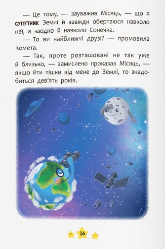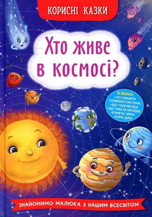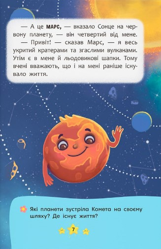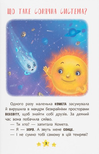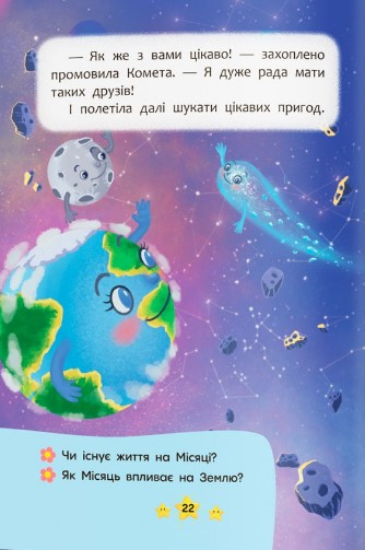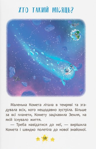 Ця книжка не звичайна, вона повчальна. Ми розповімо тобі чарівні космічні історії про наш Всесвіт та маленьку мандрівницю Комету, якій дуже кортіло знайти собі друзів та зрозуміти, що ж таке той космос. Під час захопливої подорожі Всесвітом Комета познайомилася із Сонцем та планетами Сонячної системи, затоваришувала із Землею та її вірним супутником Місяцем, зустріла безліч нових знайомих — астероїди, метеороїди, зірки та навіть чорну діру. Розгортай книжку, читай про пригоди маленької Комети й пізнавай наш Всесвіт разом з нею!