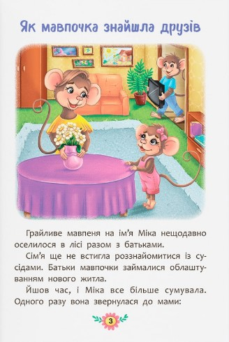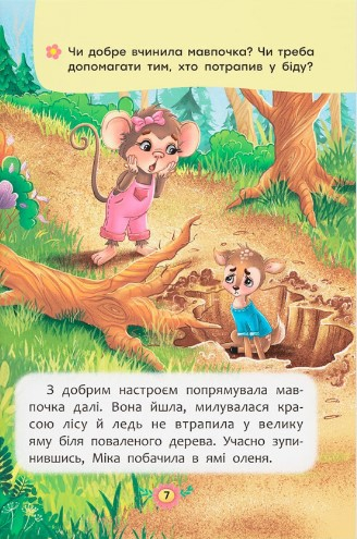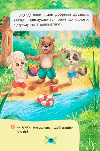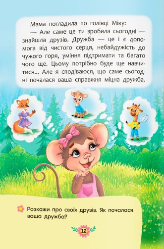 Ця книжка не звичайна, вона повчальна. Ти знайдеш у ній історії про мавпочку, яка не знала, як знайти друзів, проте дуже хотіла цього. Прочитаєш про баранчика, який так намагався справити враження на нових знайомих, що починав хизуватися та ябедничати. Познайомишся з бурундучком, який ледь не втратив друзів через свою неввічливу поведінку. Наші маленькі герої вчасно зрозуміли, як важливо цінувати друга й уміти самому бути ним. Хочеш дізнатися, як їм це вдалося? Розгортай книжку й читай казки про звірят, які змогли стати справжніми друзями і навчилися берегти дружбу.