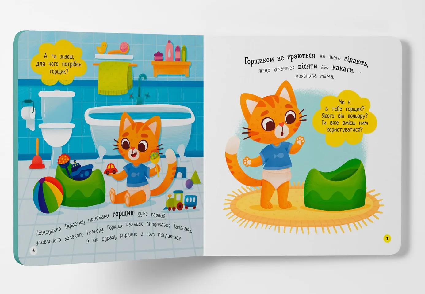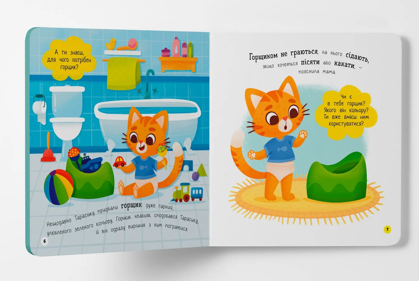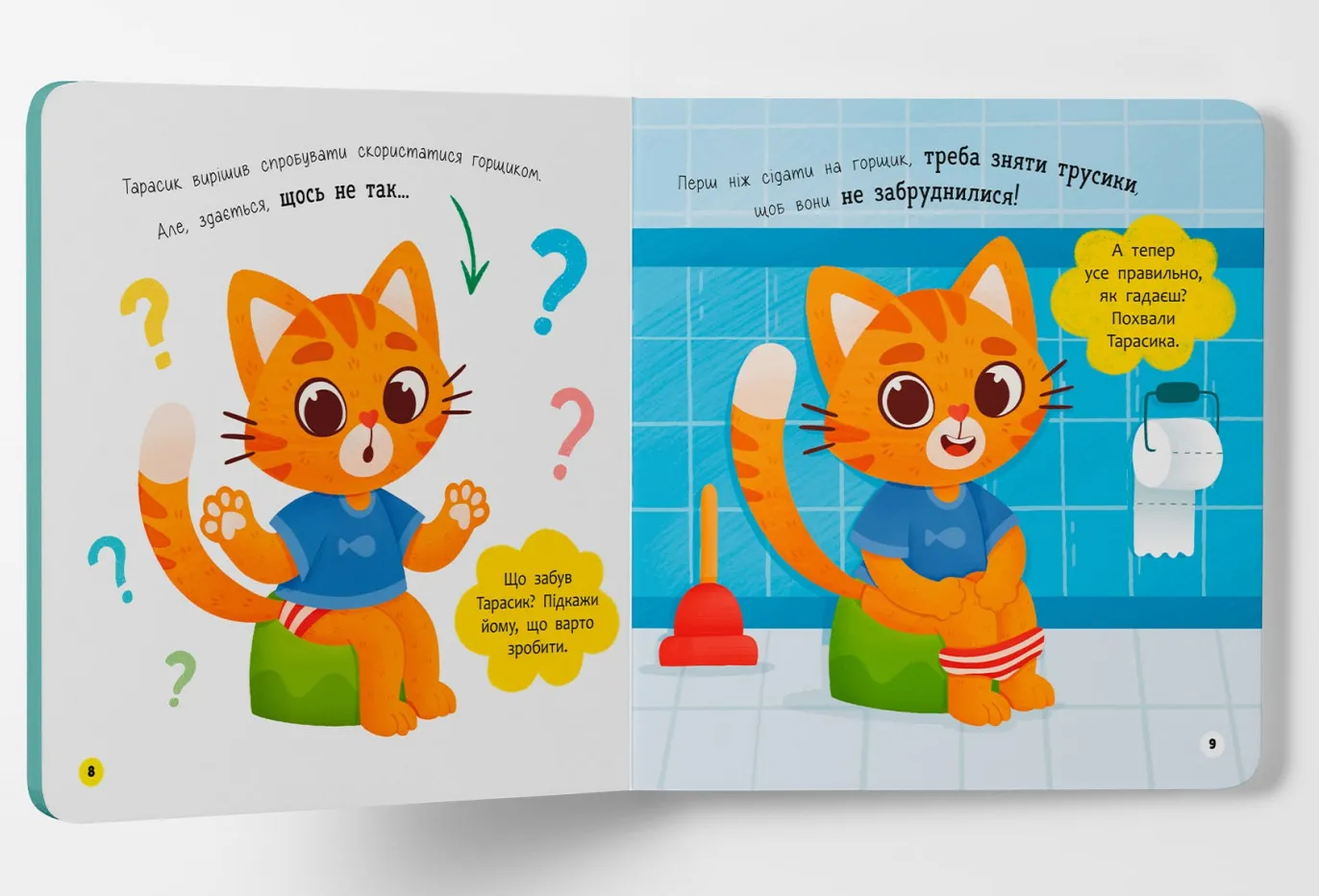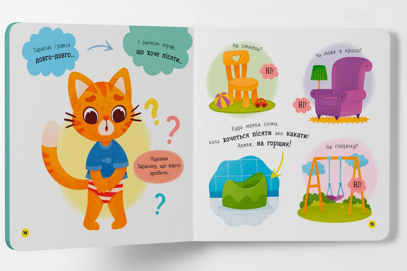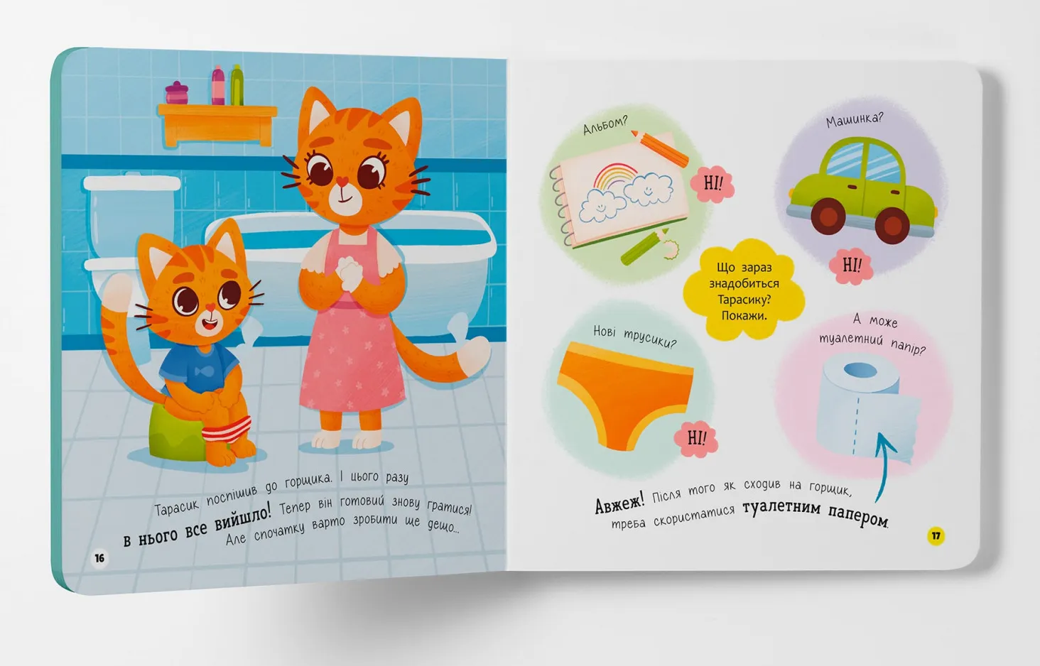 Ця інтерактивна книжка підкаже батькам, як в ігровій формі допомогти дитині звикнути до горщика. Разом з милим героєм ваш малюк засвоюватиме важливі навички: запам’ятає правильну послідовність дій — зняти штанці, сісти на горщик, скористатися туалетним папером і вимити руки. А якщо раптом не вийшло — не треба засмучуватися, варто спробувати ще. Книжка відповість на найпоширеніші дитячі запитання: навіщо йти на горщик перед сном і прогулянкою, що робити, якщо закортіло в туалет на вулиці чи в крамниці.