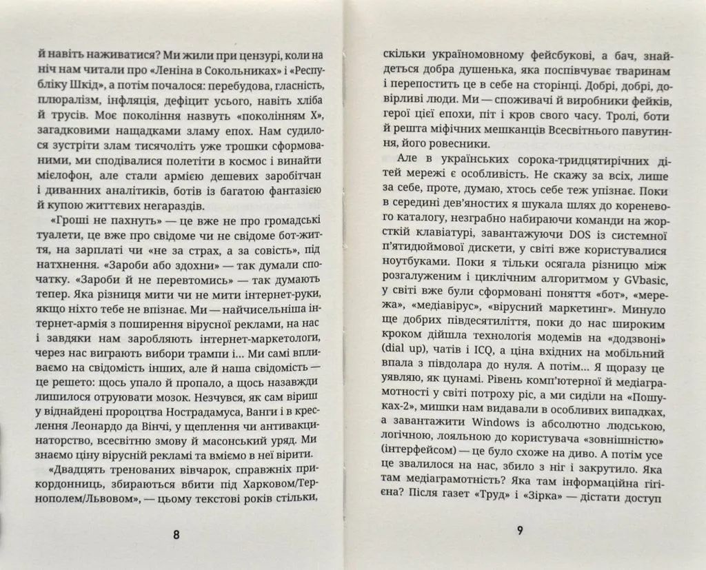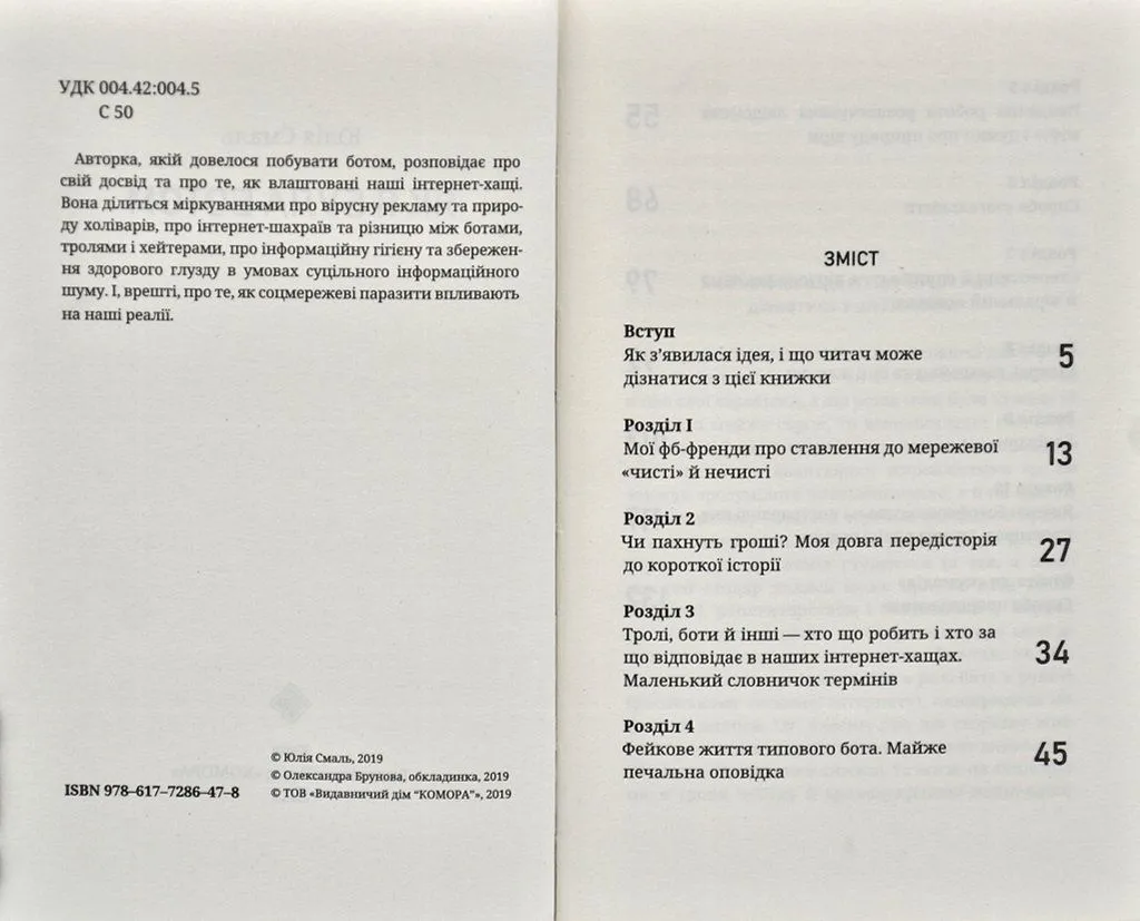 Авторка, якій довелося побувати ботом, розповідає про свій досвід та про те, як влаштовані наші інтернет-хащі. Вона ділиться міркуваннями про вірусну рекламу та природу холіварів, про інтернет-шахраїв та різницю між ботами, тролями і хейтерами, про інформаційну гігієну та збереження здорового глузду в умовах суцільного інформаційного шуму. І, врешті, про те, як соцмережеві паразити впливають на наші реалії.