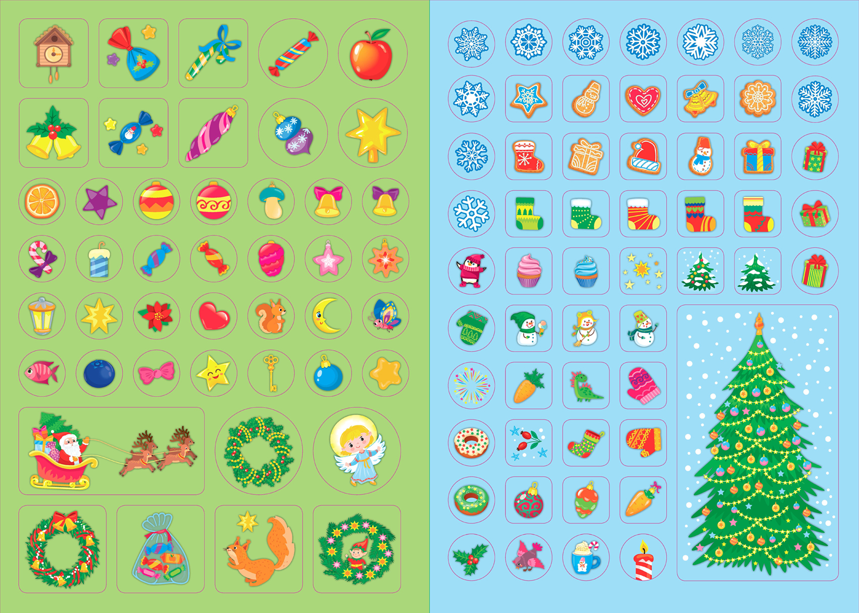 - Новорічна ялинка: Книжка містить 200 яскравих стікерів, які можна використовувати для прикрашання, а також великий яскравий плакат. Дитина може написати листа святому Миколаю, вирізати ялинкові прикраси та створити святкову атмосферу власноруч.