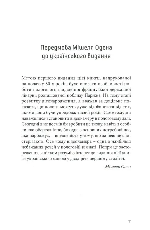 Вперше найвідоміша книга французького доктора Мішеля Одена – історія пологового відділення в лікарні м.Пітів’є – була видана у 1984 р США, згодом перекладена 13-ма мовами світу. При Одені природність та свобода стали лікарняною практикою; поклавшись на фізіологію, лікар і півдюжини акушерок змінили ставлення до пологів і практику в усьому світі. І продовжують змінювати. Палати з домашньою обстановкою, мінімум втручань у несвідомий процес пологів – тиха революція: головні дійові особи в пологах – жінка … та її дитина. У центрі – особистісні, а не технічні аспекти пологів.Книга призначена для широкого кола читачів: батьків, які знаходяться в очікування дитини, акушерів та лікарів, які готові переглянути загальноприйняті підходи, студентів медичних навчальних закладів, доул та психологів.