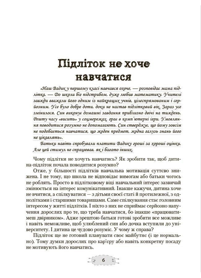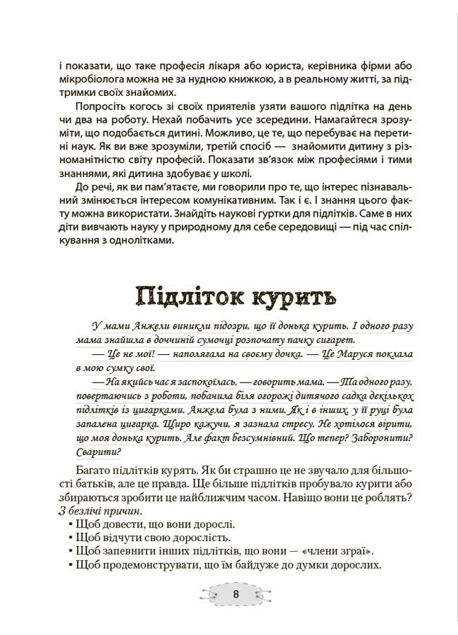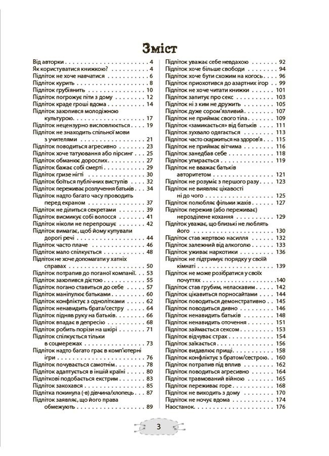 Авторка наводить 83 типові ситуації, які змушують батьків ламати голову: від складнощів у спілкуванні до серйозних емоційних переживань підлітка. Наприклад: