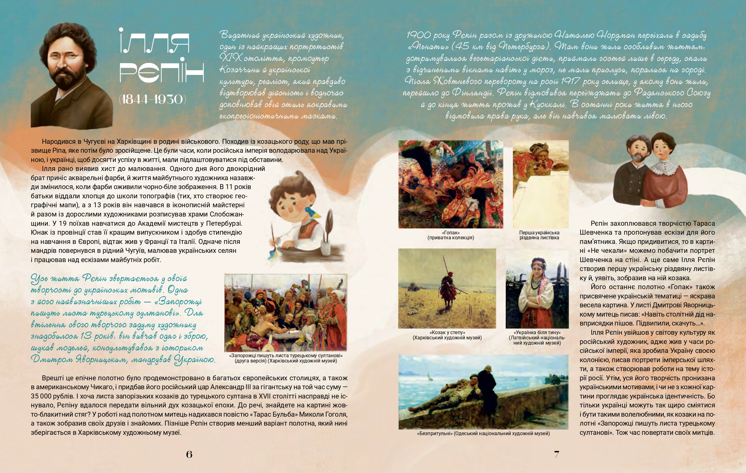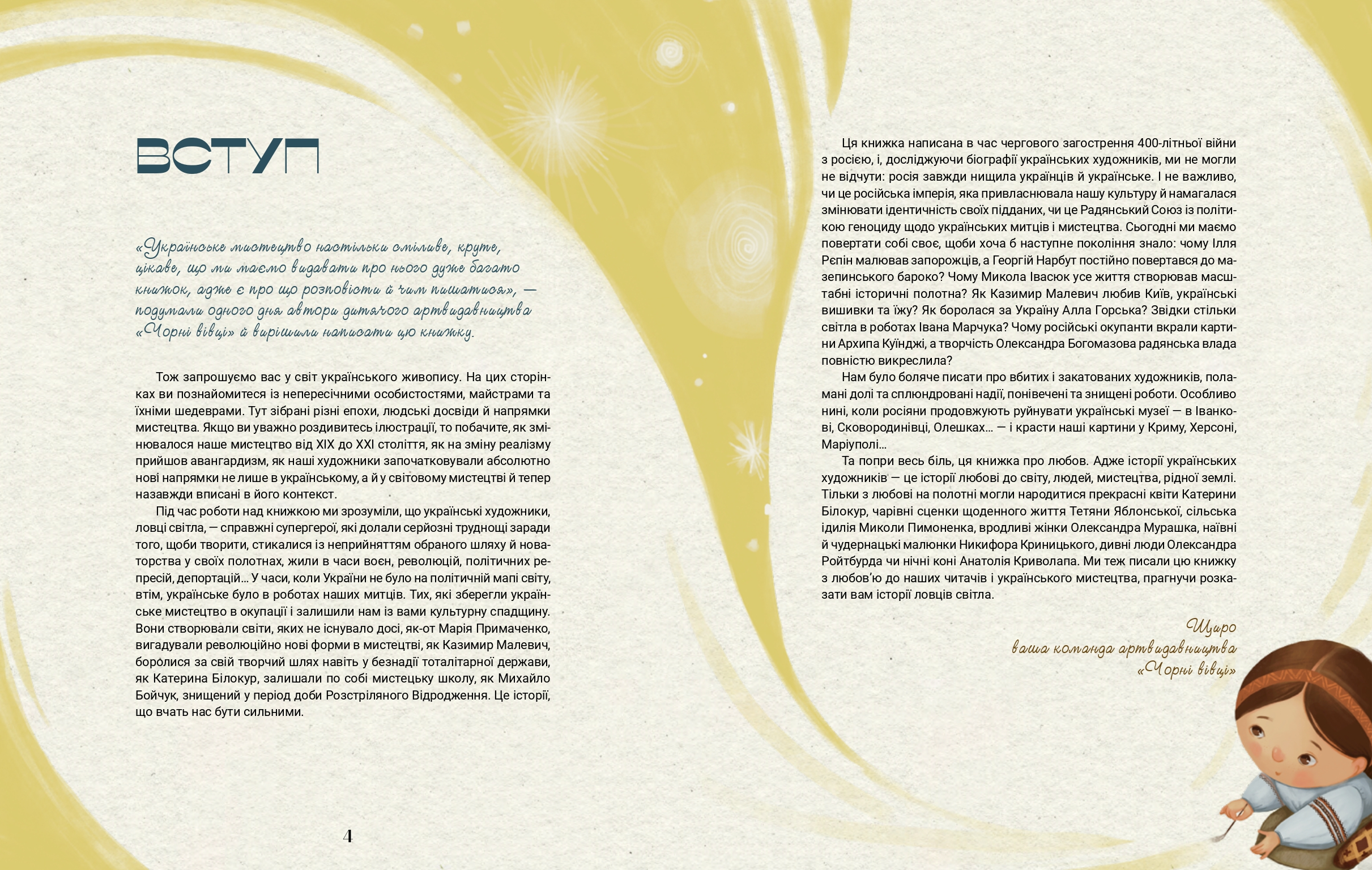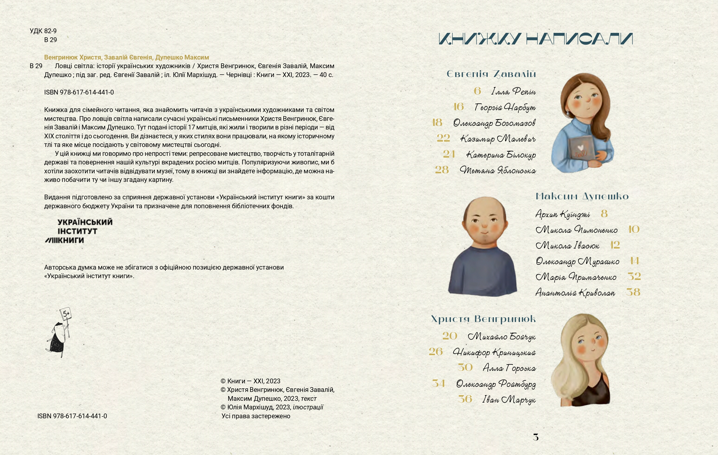 Видання для всієї родини, яке розповідає про життєвий шлях і творчість видатних українських митців: Іллі Рєпіна, Архипа Куїнджі, Миколи Пимоненка, Миколи Івасюка, Олександра Мурашка, Георгія Нарбута, Олександра Богомазова, Михайла Бойчука, Казимира Малевича, Катерини Білокур, Никифора Криницького,Тетяни Яблонської, Алли Горської, Марії Примаченко, Олександра Ройтбурда, Івана Марчука, Анатолія Криволапа, — а також демонструє деякі їхні картини із вказівкою, в яких саме українських музеях ті зберігаються.Книжка «Ловці світла: історії українських художників» занурює у світ мистецтва, знайомить із його течіями та виховує естетичне бачення. Сподіваємося, що вона стане світлим променем, який сяятиме й тішитиме око й душу читачів.