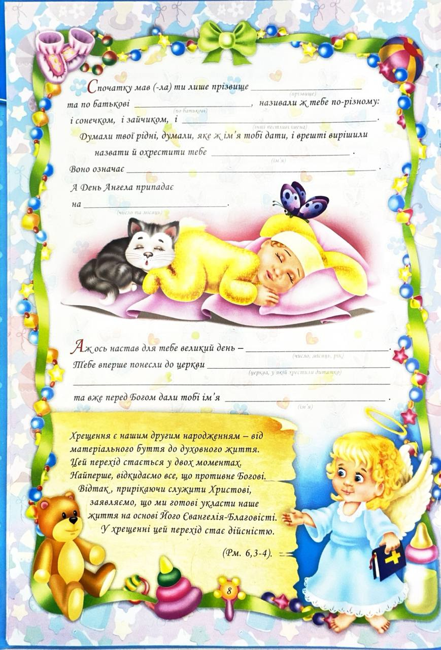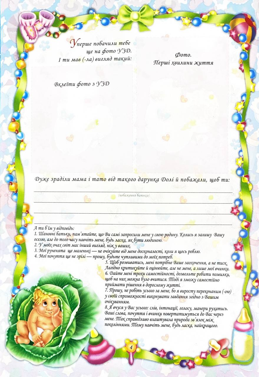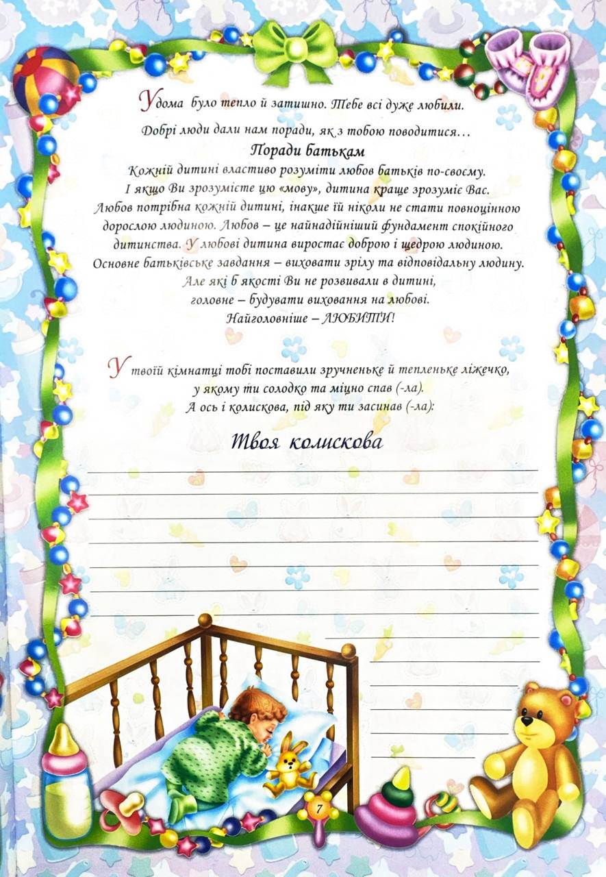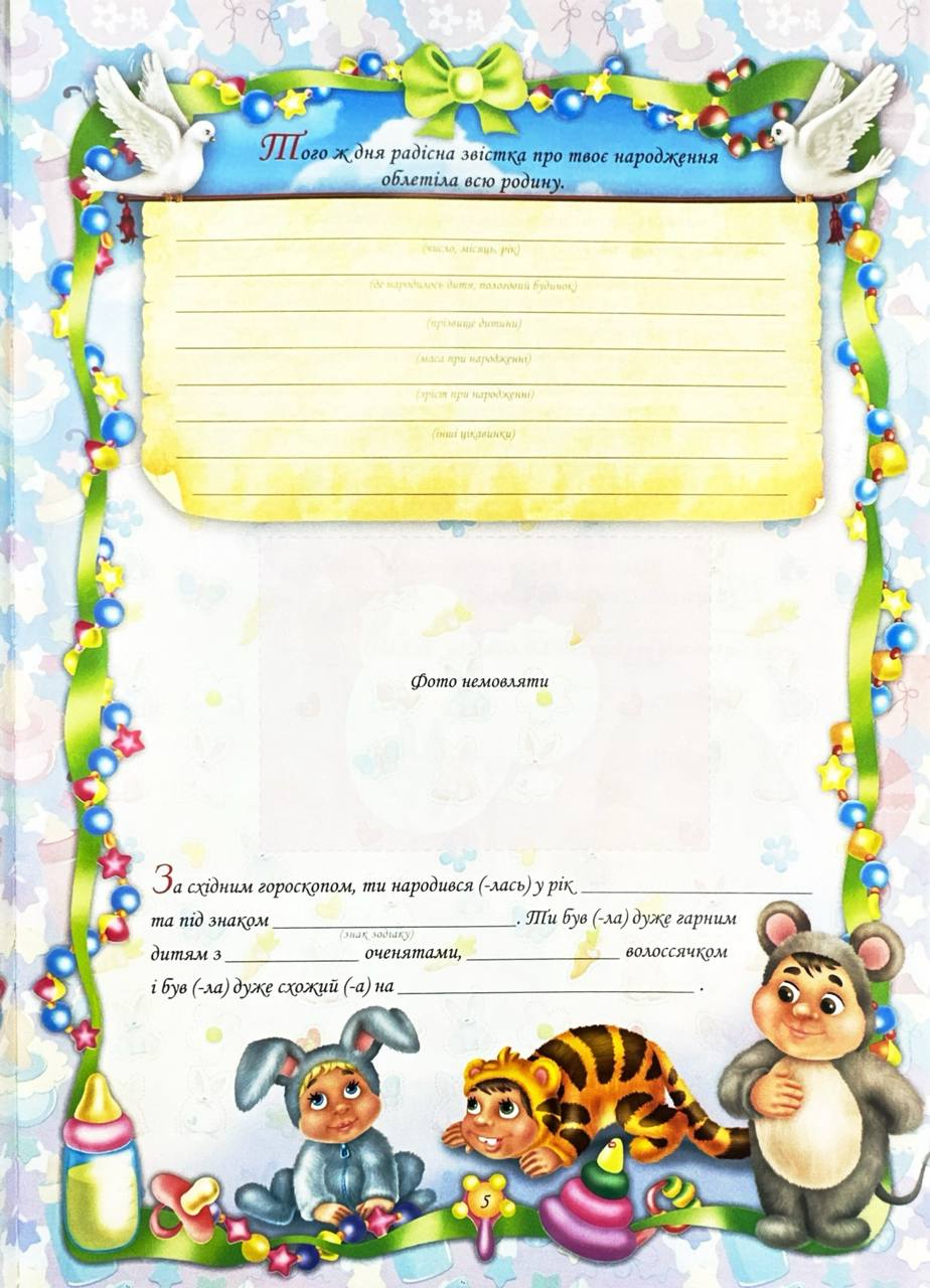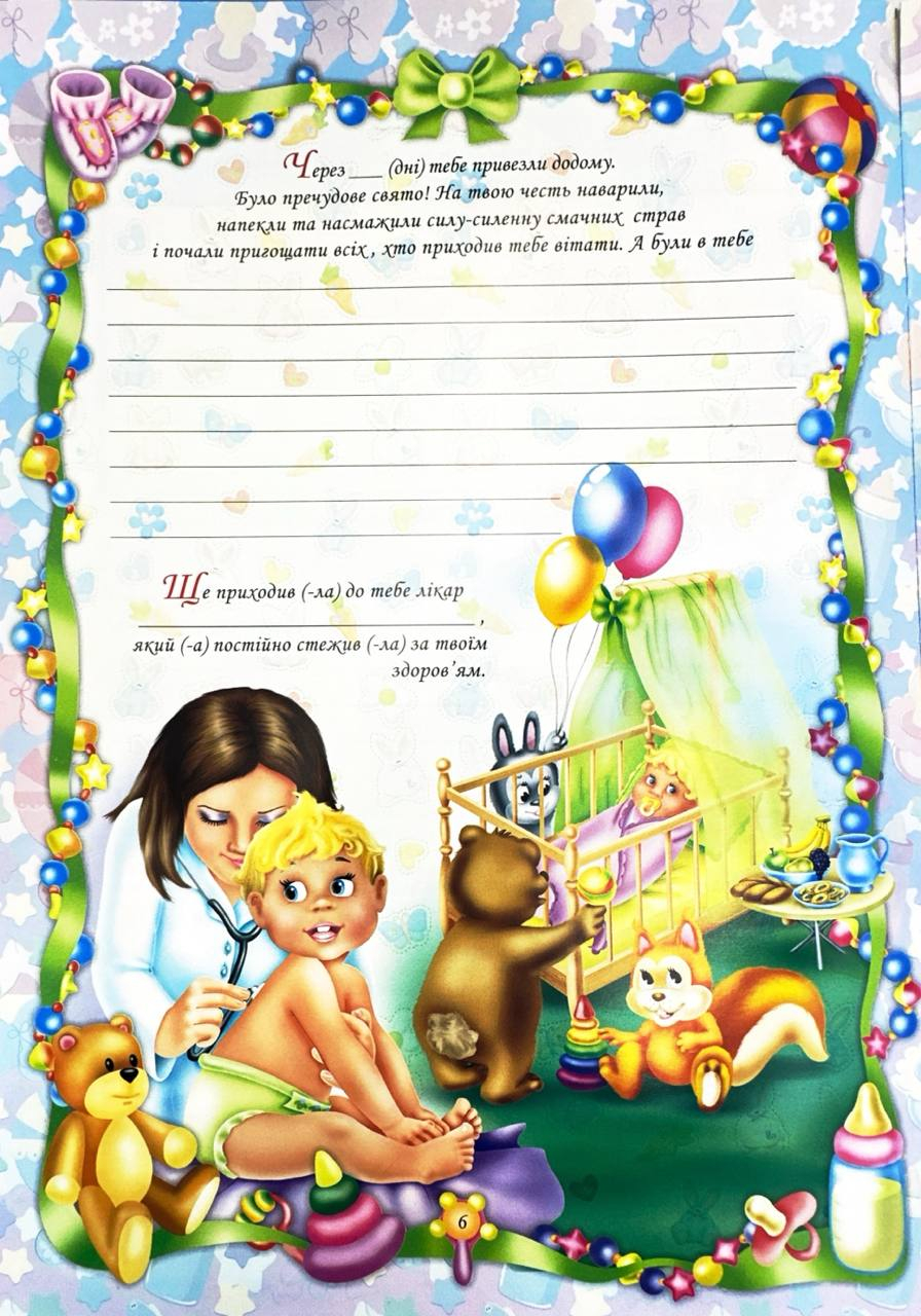 Кольорові малюнки, місця для фото та запису головних етапів у житті маленької людини - роблять цей альбом майбутньою реліквією родини.