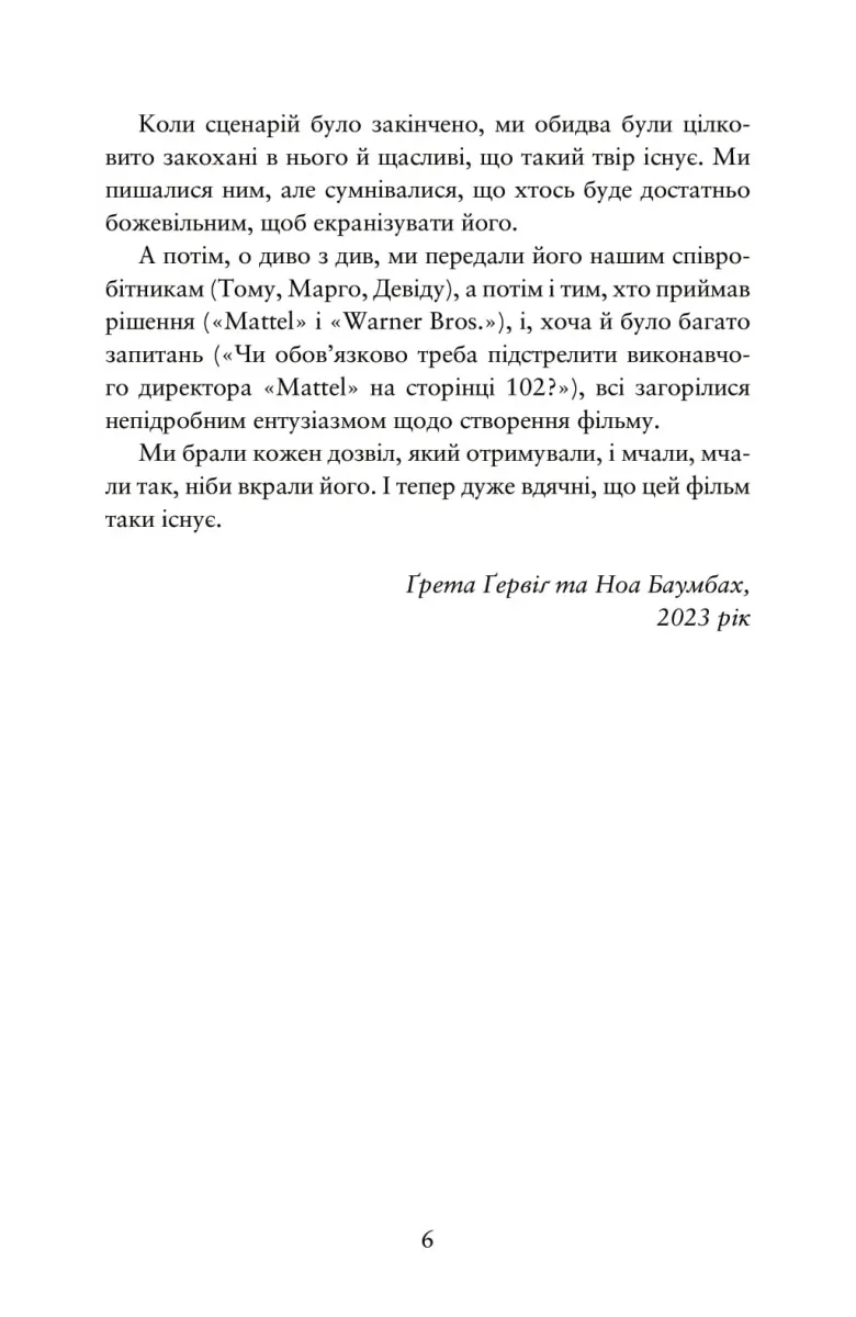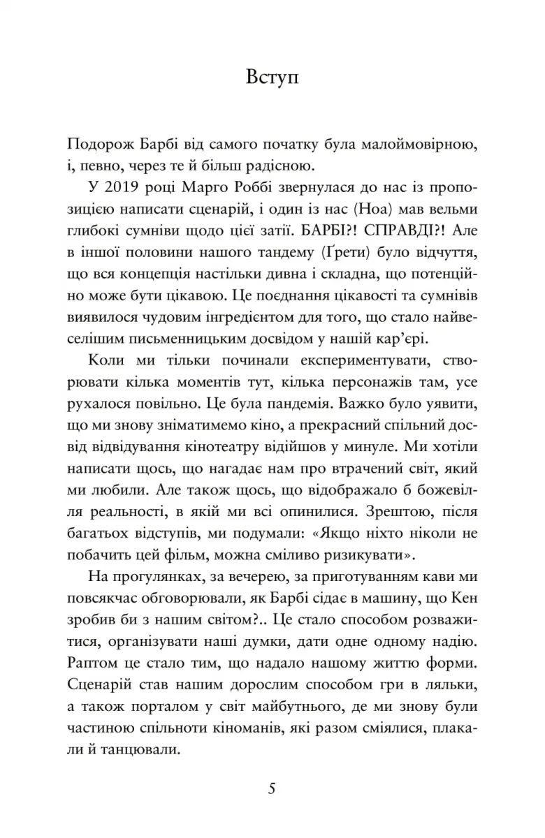 Книга Барбі. Сценарій фільму, який здивував світ — це не просто адаптація однойменного кінобестселера, а повноцінне художнє видання, яке відкриває завісу над творчим процесом створення одного з найгучніших фільмів 2023 року. Авторка Ґрета Ґервіґ, відома своїм нестандартним підходом до жіночих образів, подає глядачам та читачам глибший сенс історії, захованої за зовні рожевим фасадом Барбіленду.