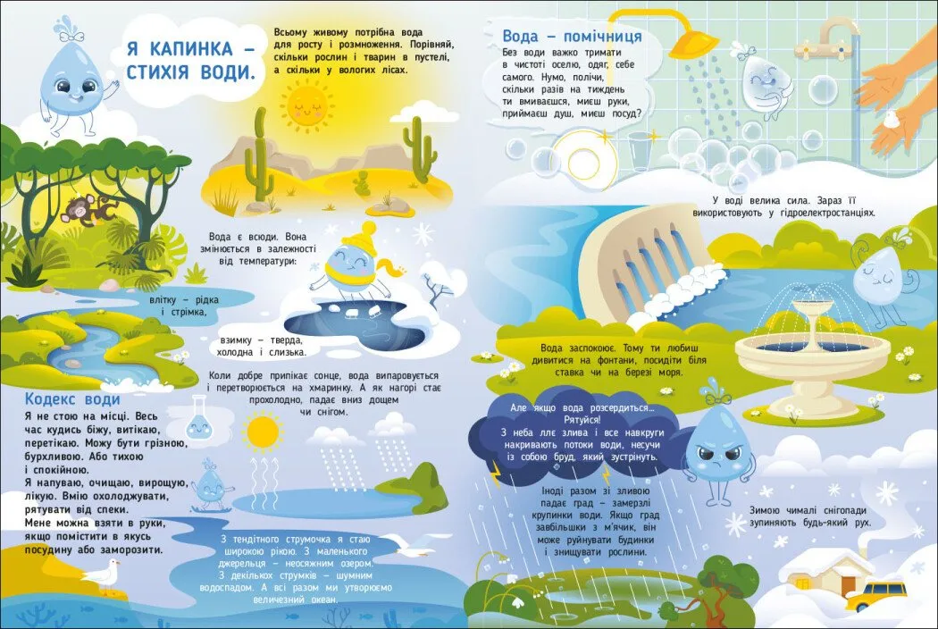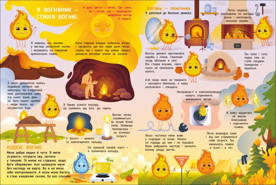 У книзі подані цікаві факти, легко зрозумілий текст для дітей, а також інтерактивні завдання у кінці, які дозволяють перевірити знання, пограти з уявними образами стихій та краще їх запам’ятати.